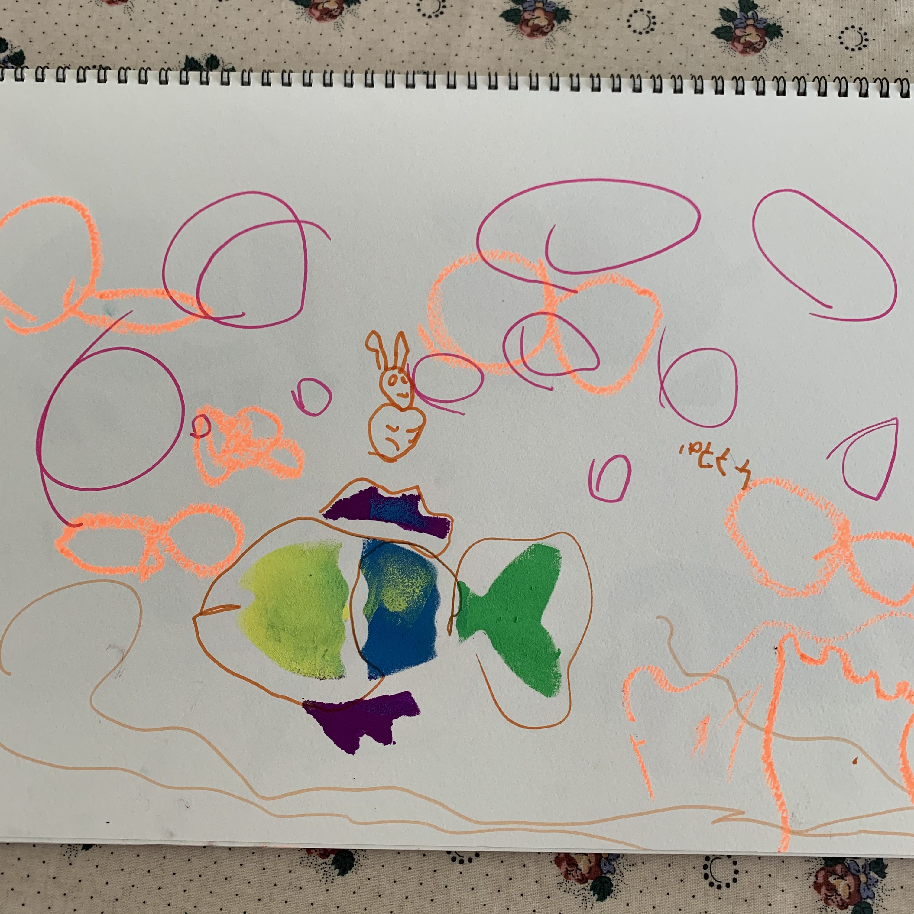 お魚の絵は釣り堀で釣りをした時を思い出したようで、餌がいっぱい浮いているようです。(なかなか釣れなくてくやしかったのが印象に残っているのかもしれません💦笑)なぜかトトロの妖精も浮いているらしいです😅