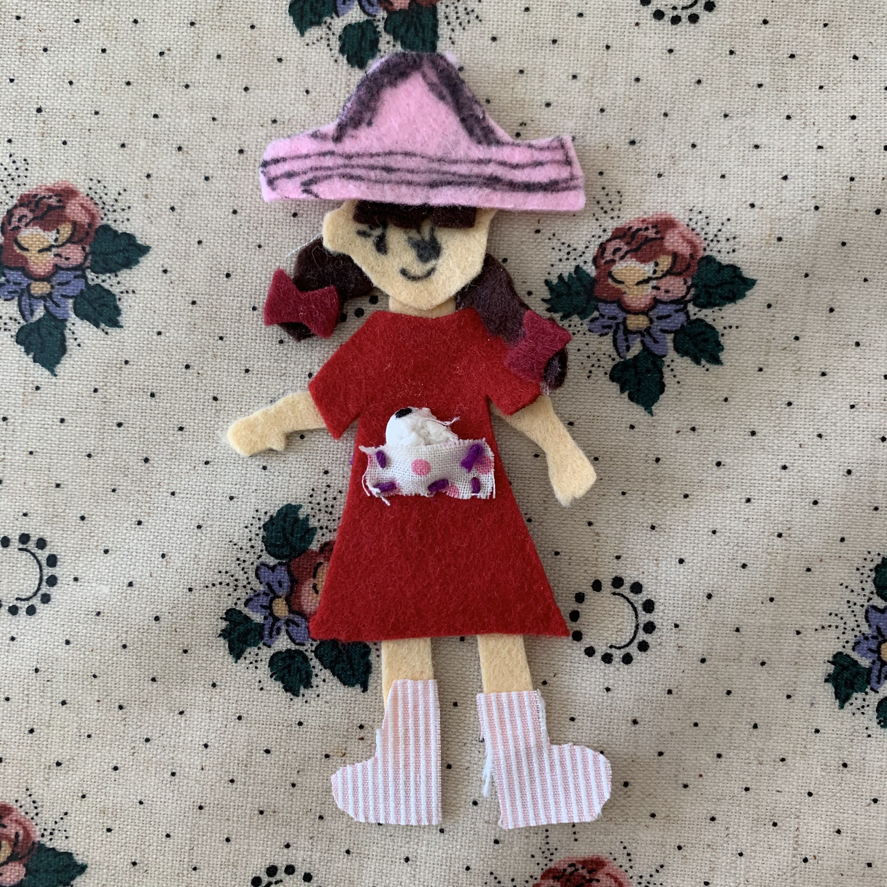 「小人の人形を作りたい」と母と一緒に作りました。ポケットは頑張って縫って、おにぎりが入っています🍙