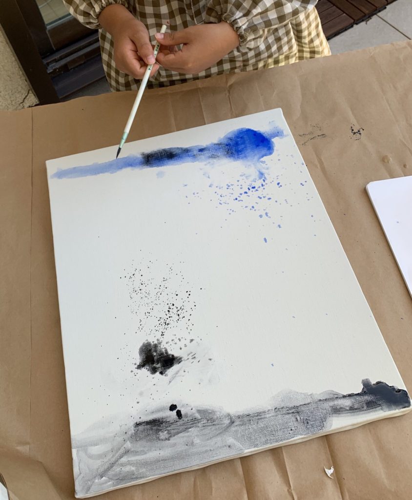 その前に筆に水だけをつけて真っ白いキャンバスに落とす。オンラインで教えてもらった事。