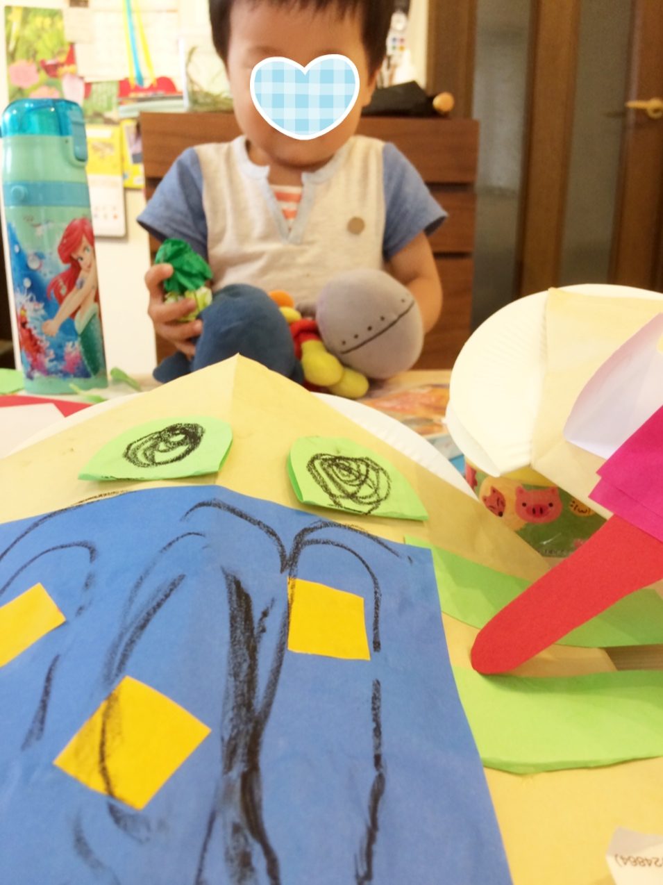 作ったかえる達で長いこと遊んでいました。この日買ったプール用のゴーグルをかえるにも着けるというのをひらめき、折り紙でゴーグルつくっていました。一緒に浮き輪をつけてポーズ!