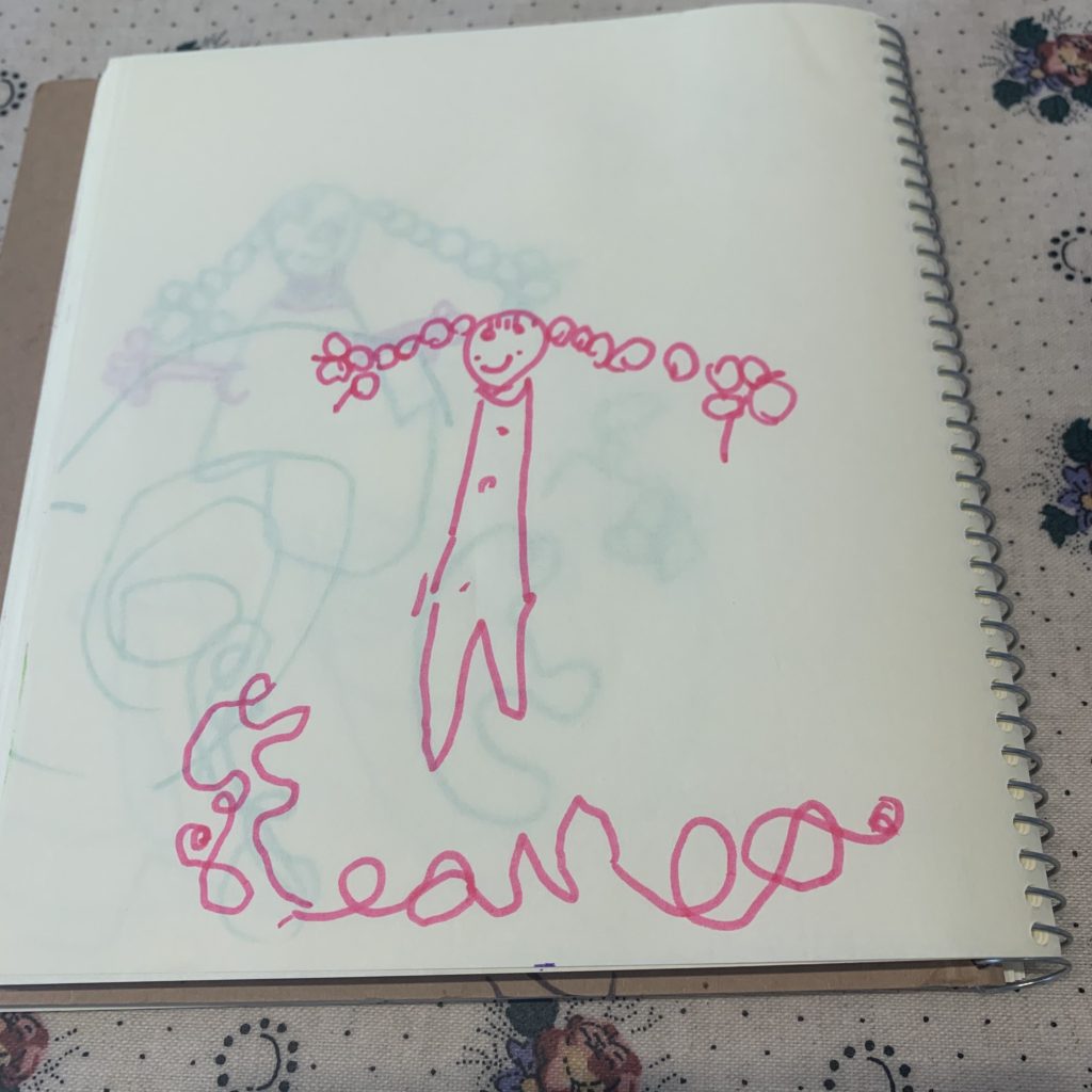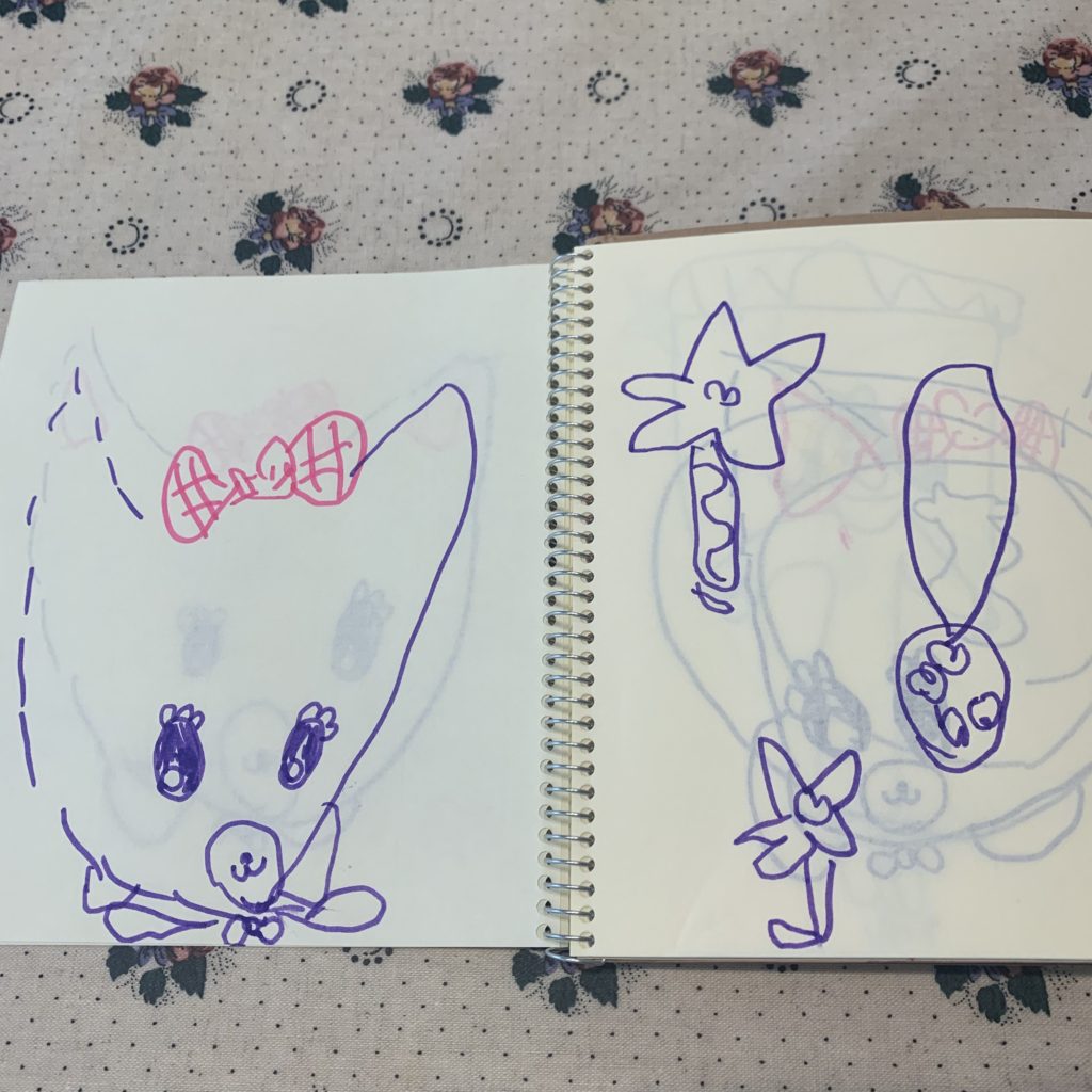 最近は結構へとへとで園から帰ってきて、落書き程度のお絵描きしかしませんが、三つ編みの女の子やミューちゃんはお気に入りのようで何度も描いています☺️
