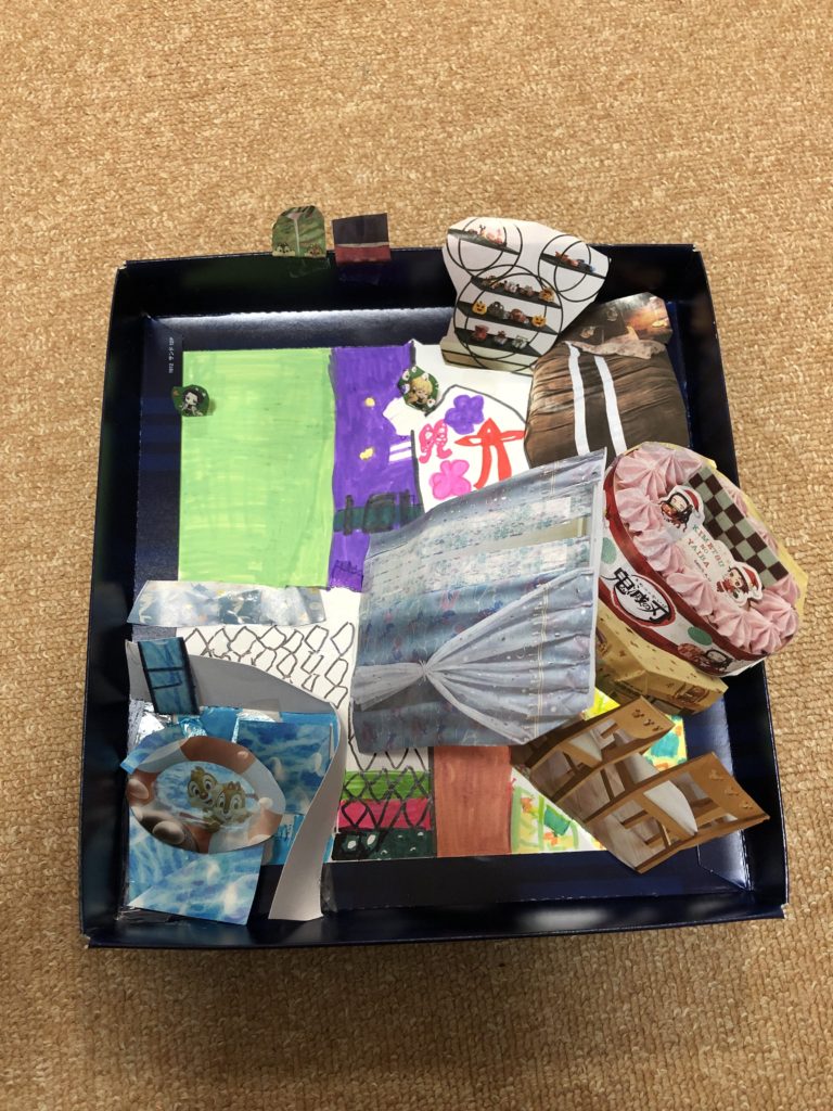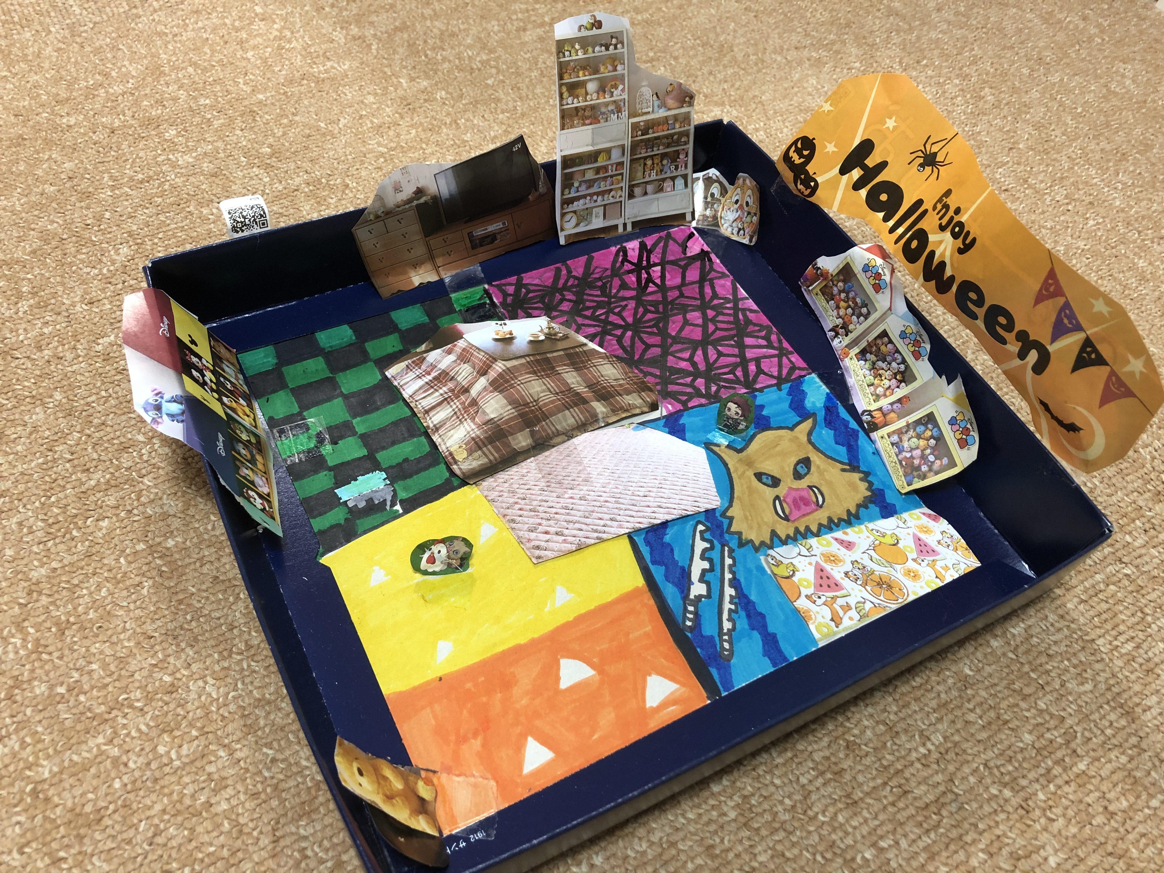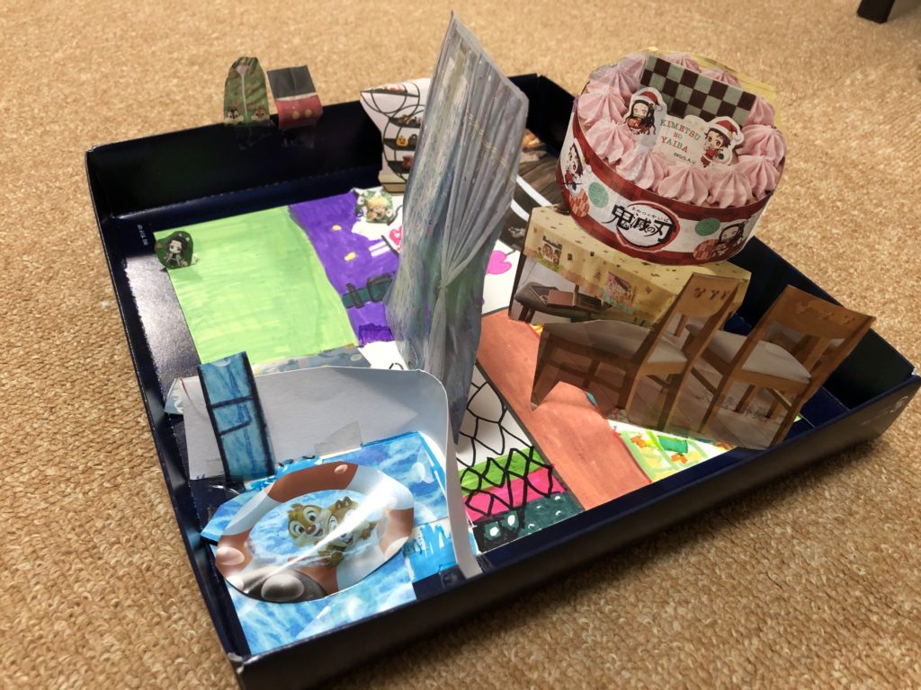 色んな家具のカタログを切り貼り。床には好きな鬼滅のキャラクターの衣装を描き込んで、お気に入りのお部屋を作りました。