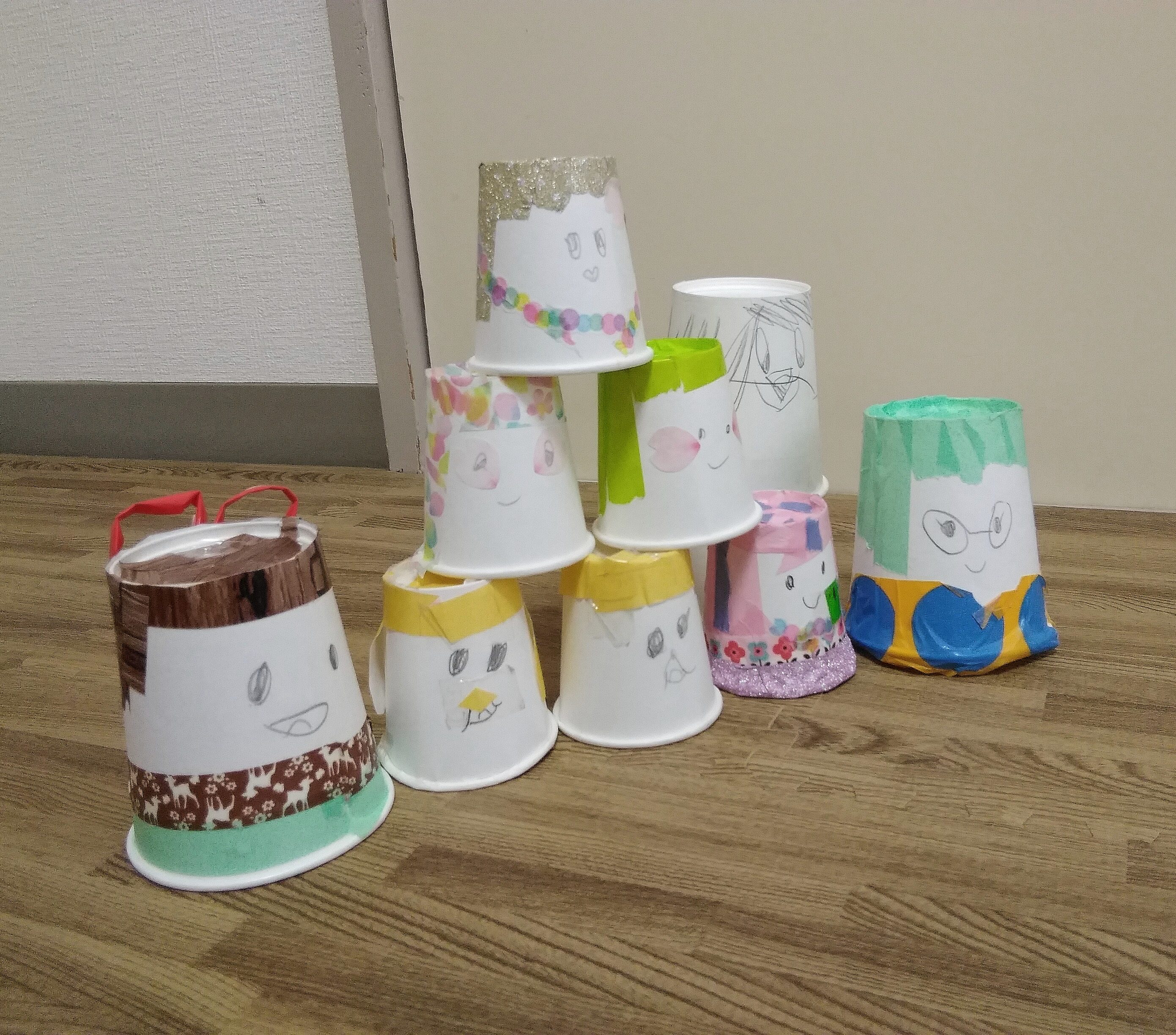 なるほど! マスキングテープとかみこっぷでお人形になるんだ! 丸いかたちだからテープをはるのがむずかしいんじゃないかな? かみのけのところなんて、すっごくうまいね! それぞれのキャラクターがいろいろあってたのしいね!