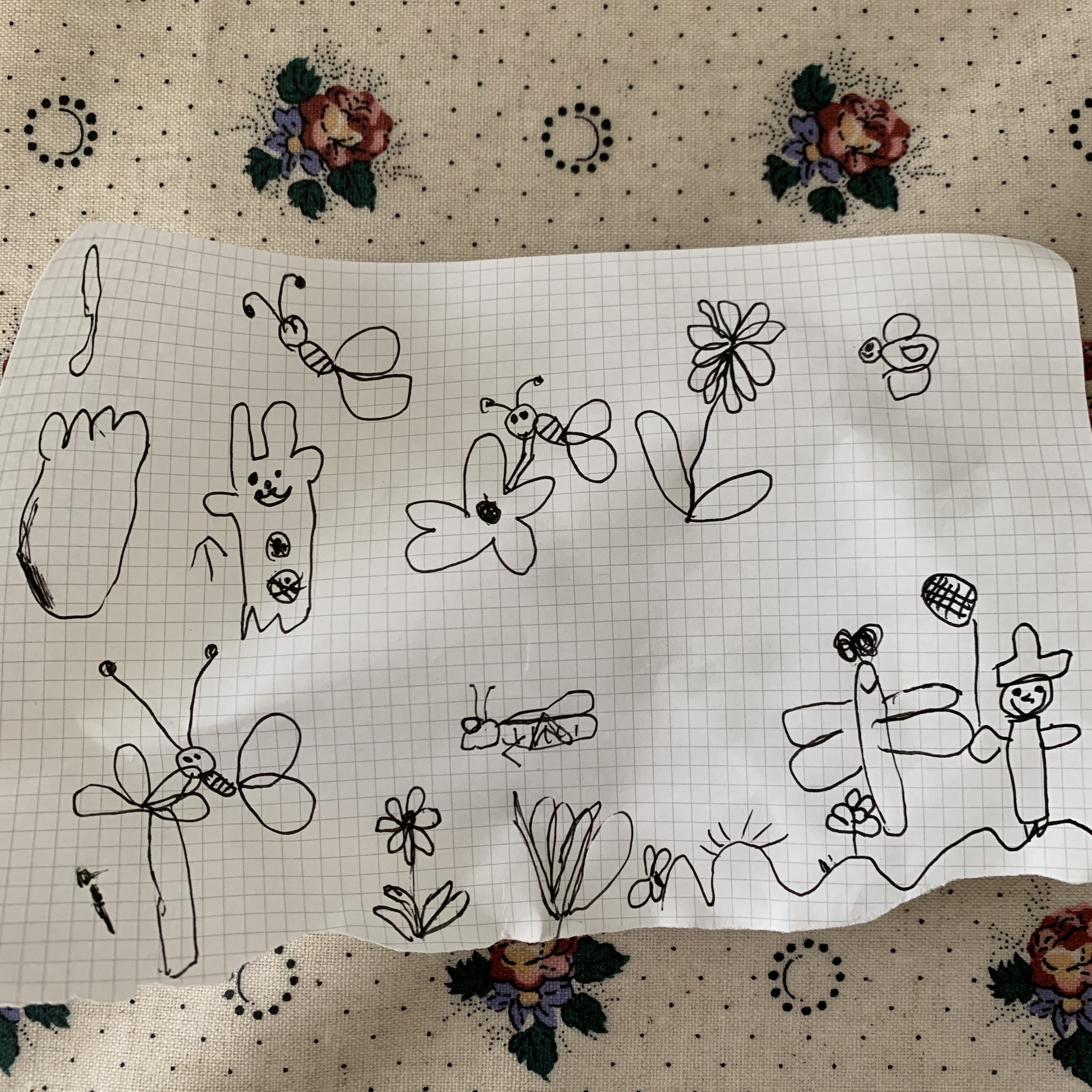 2枚目 虫捕り(バッタだけお父さんが描きました)