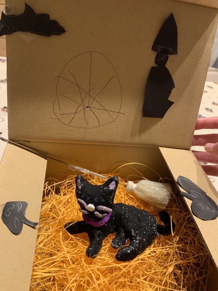 紙粘土で一緒に作った黒猫、ほうき、蜘蛛の巣、かぼちゃ、魔女の影などハロウィン工作
