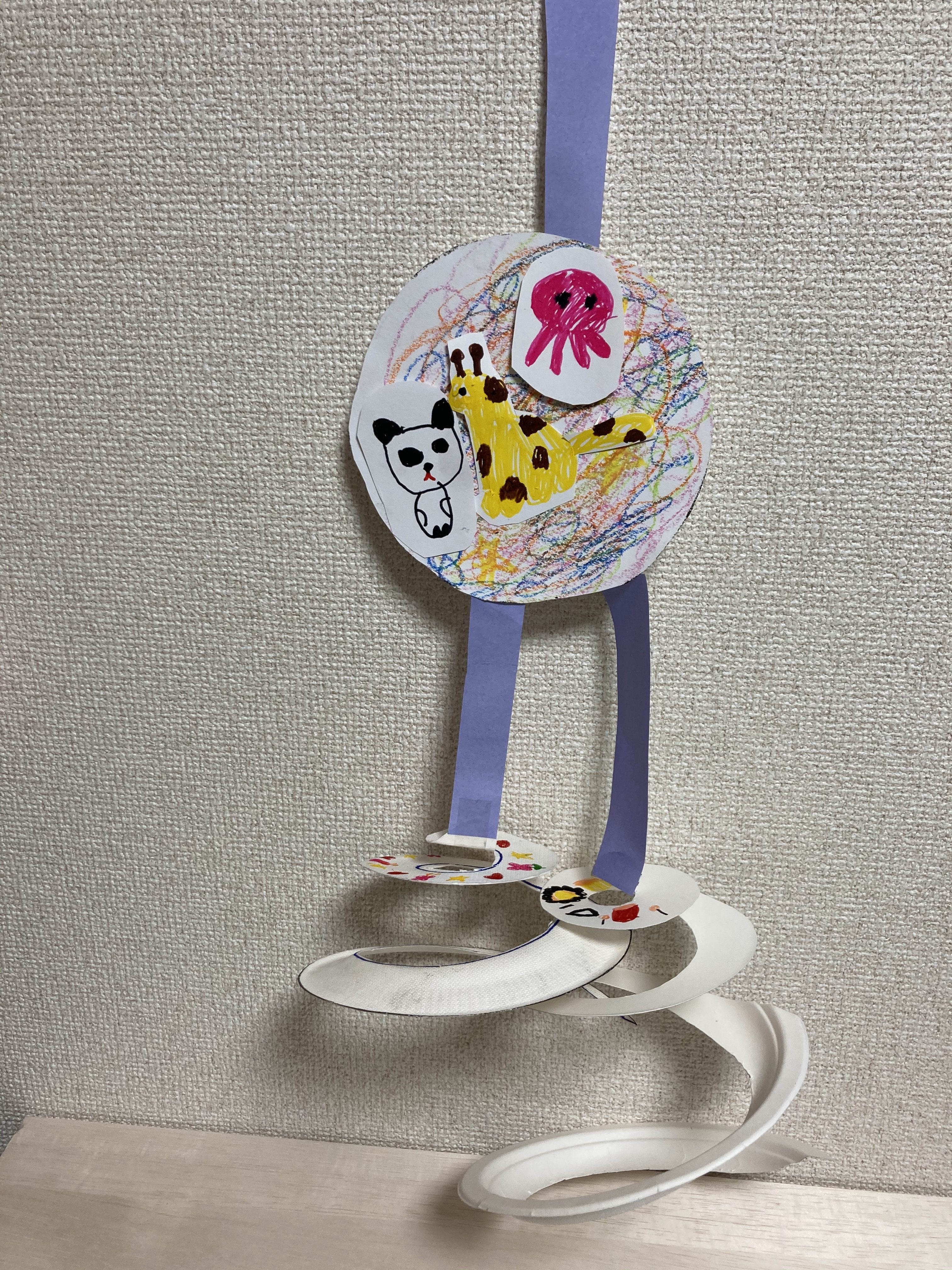 クレヨンで描いたぐるぐるの星にキリン・パンダ・クラゲを貼り付けました。