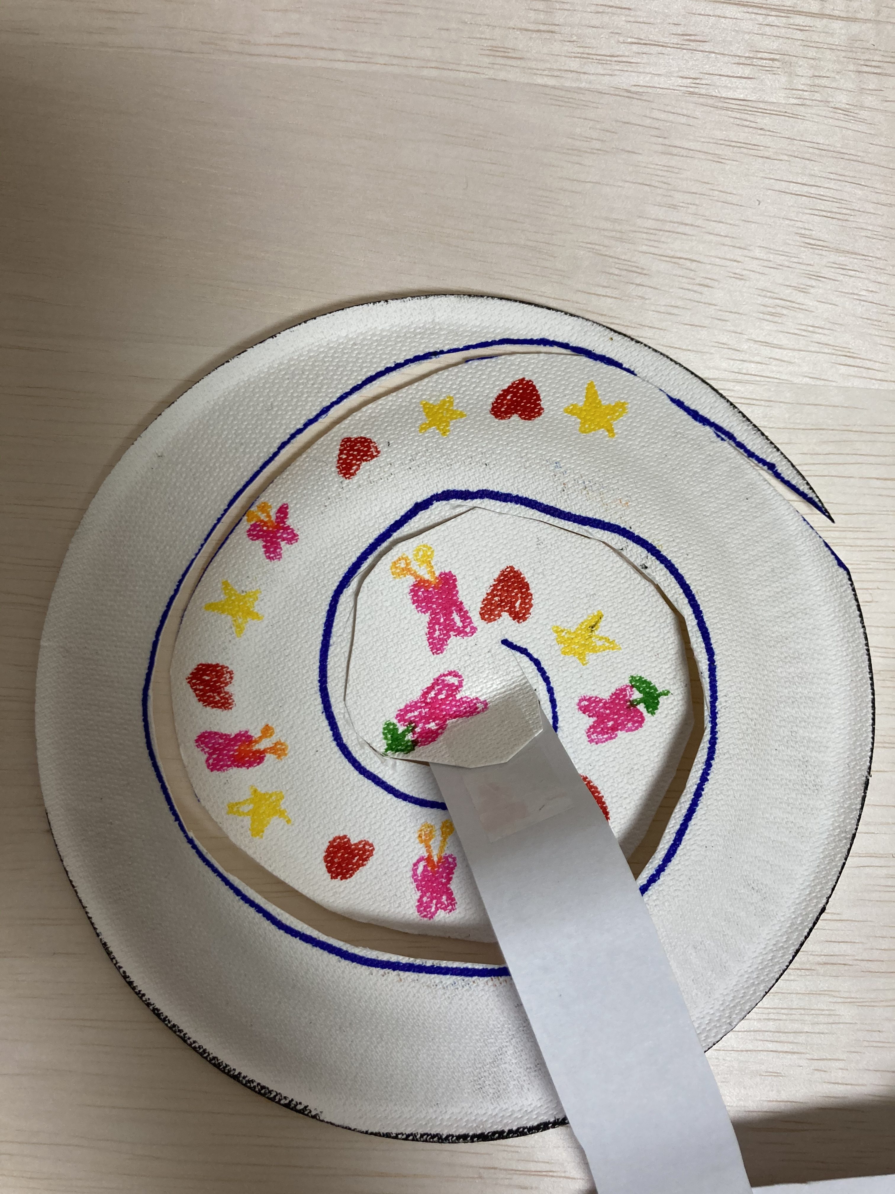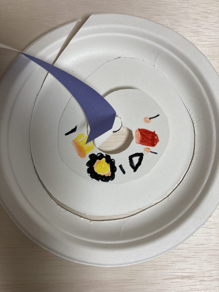 紙皿には、ハートや蝶など自分の好きな模様と、最近幼稚園で合奏の練習に使っている楽器の絵を描きました。