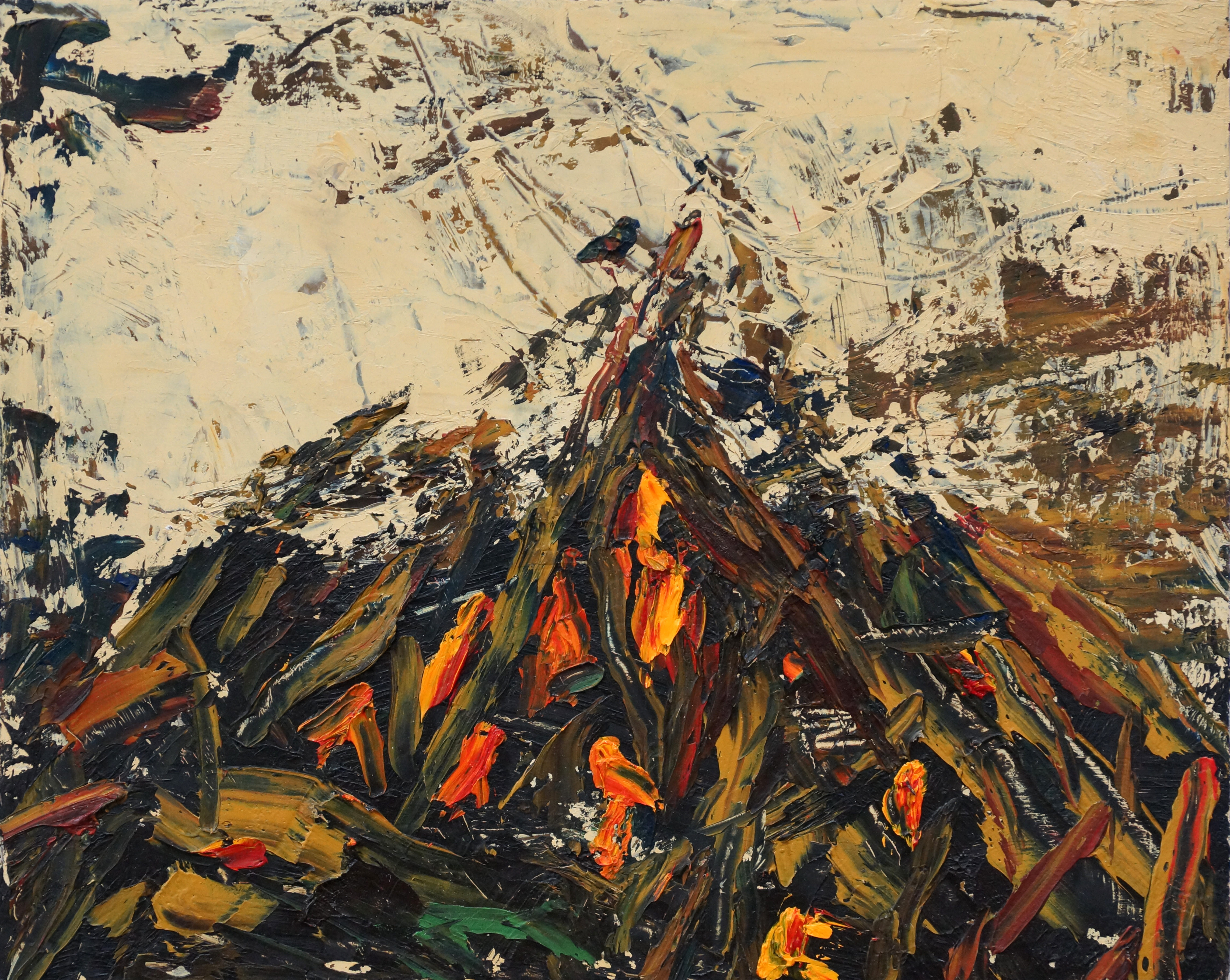 木製パネルに油彩 課題の試作ではなく作品ですが、しんぺい先生は普段からペインティングナイフを使った制作が主です。 絵具が物質感を保ったままでいられることとその感触がダイレクトに腕に伝わるところ、無作為な表情(マチエール)との対話によって即興的に絵画を構築することを考えています。 それは火に薪を焚べる行為に似ています。