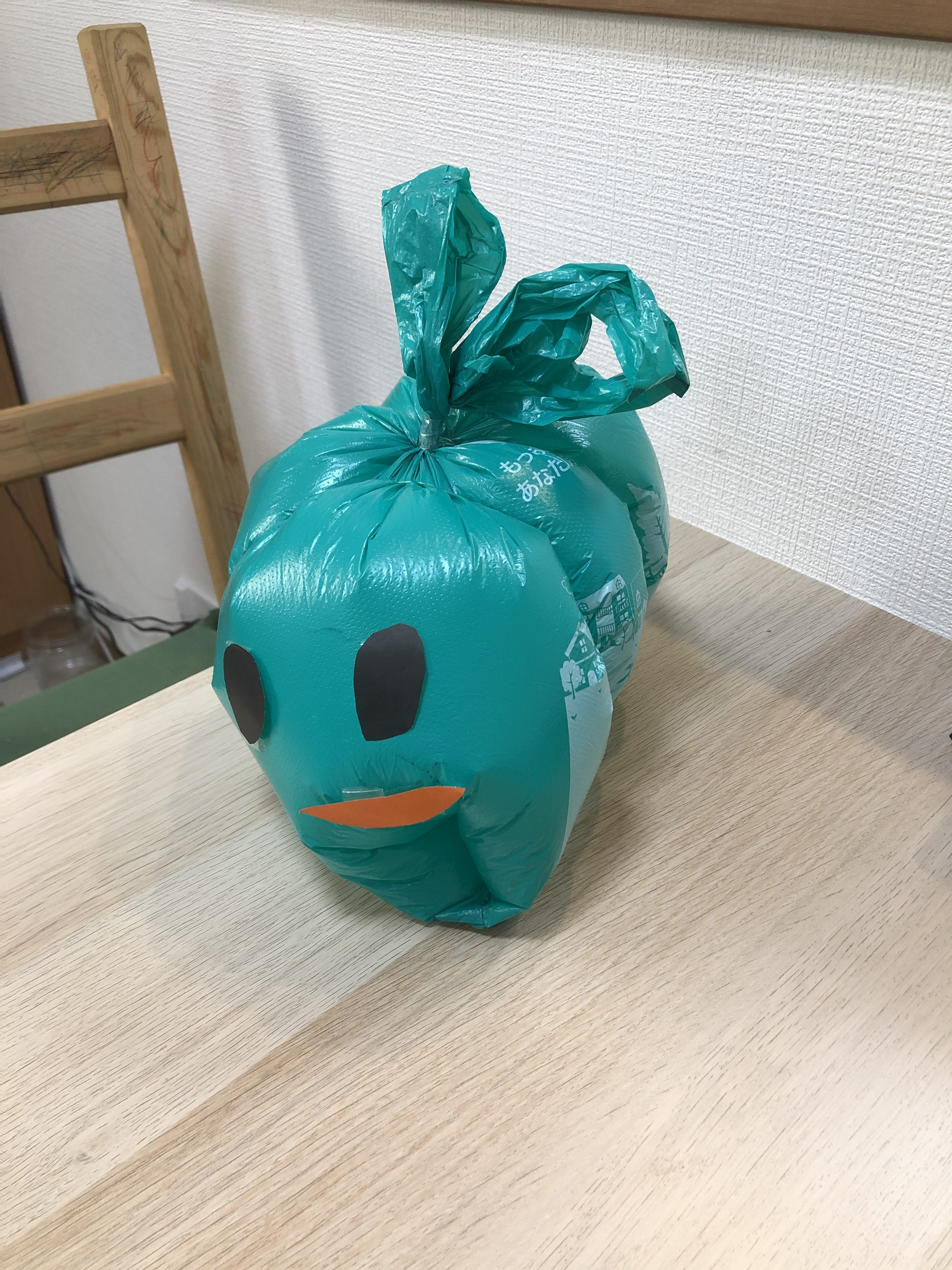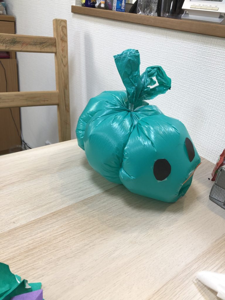 輪ゴムで青虫のデコボコを表現しました。目とお口のサイズにこだわってます!
