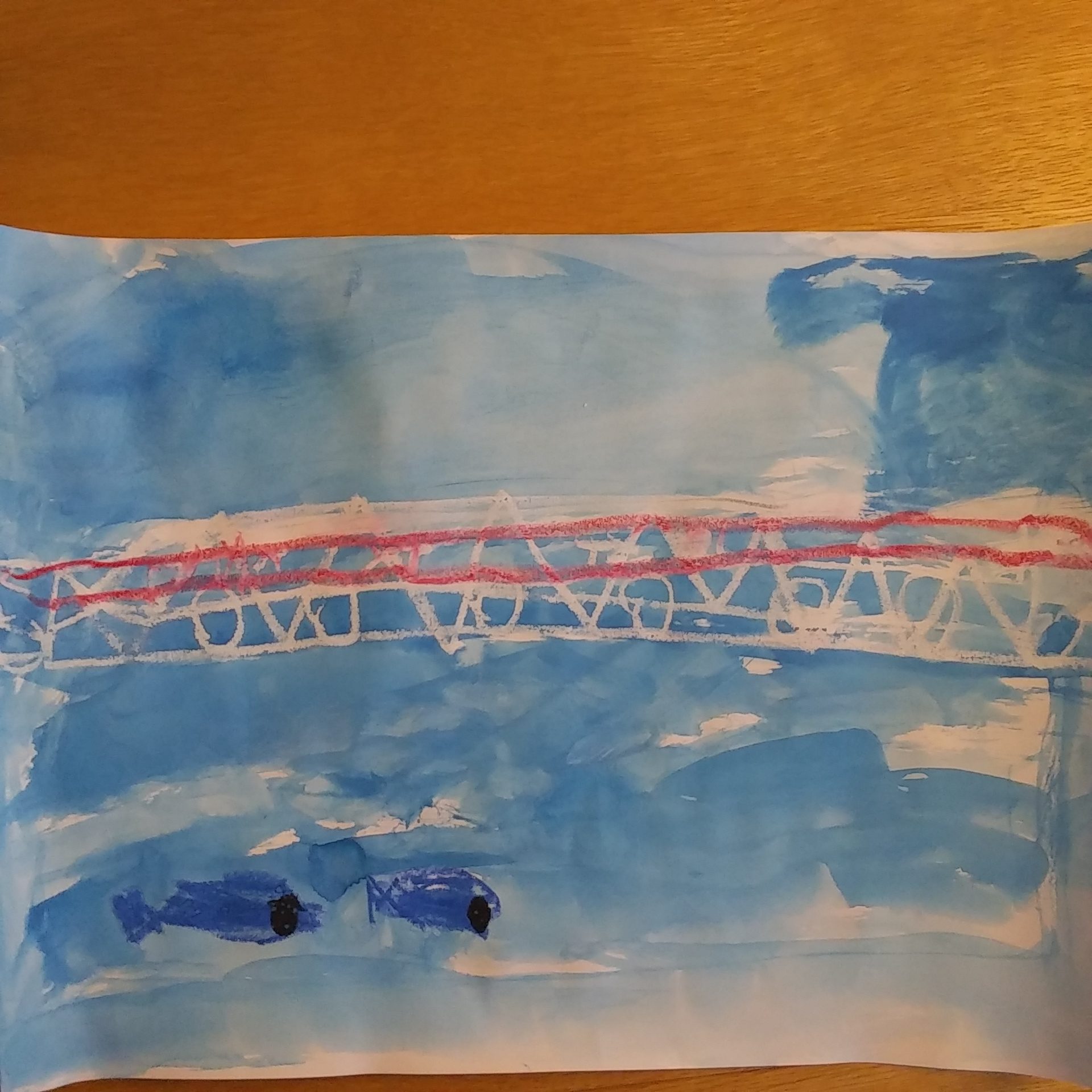 としくん! zoomのさくひんだね! もりやでみたそらをちゃんとおぼえているのが、テンサイだよ! でんしゃにのりながらみえたそらと さかななのかな?