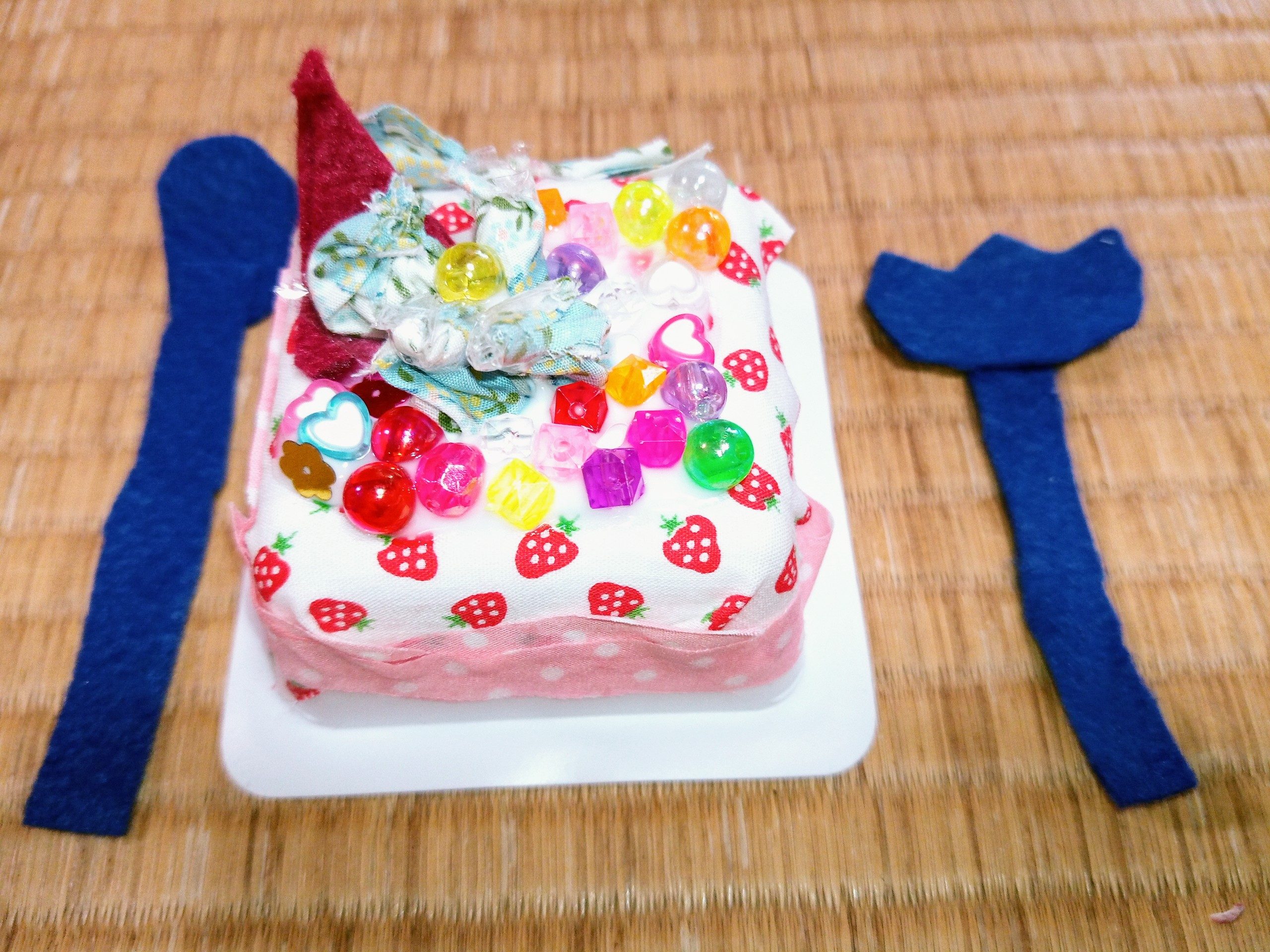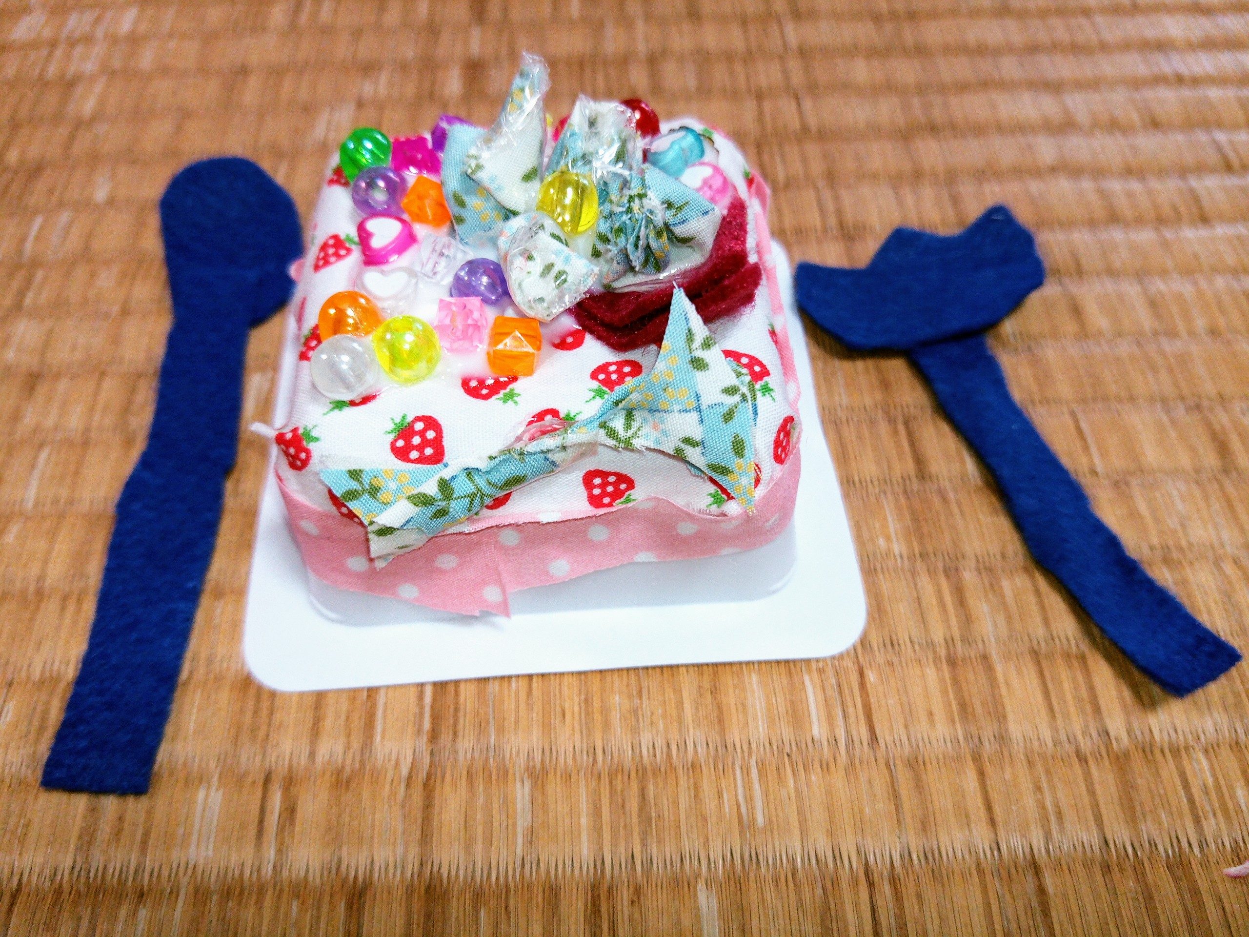 上に乗せたクリームは、水色の布を針と糸で縫ってふっくらさせてから、お花の形に飾りつけました🌼