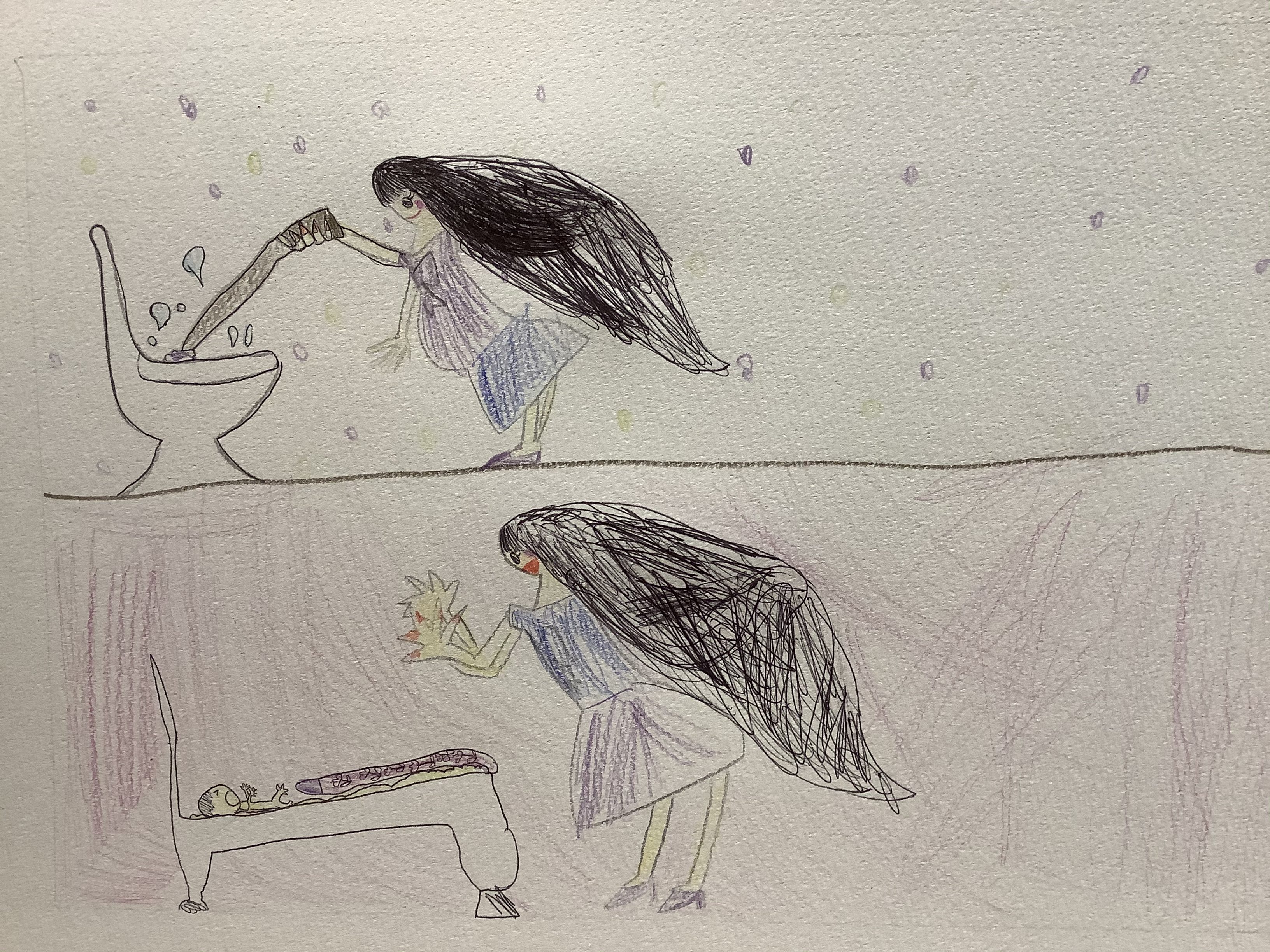 それにしても、上の絵を見て思いましたが、おなかが大きいのにトイレそうじをするのは、たいへんそうですね🙄