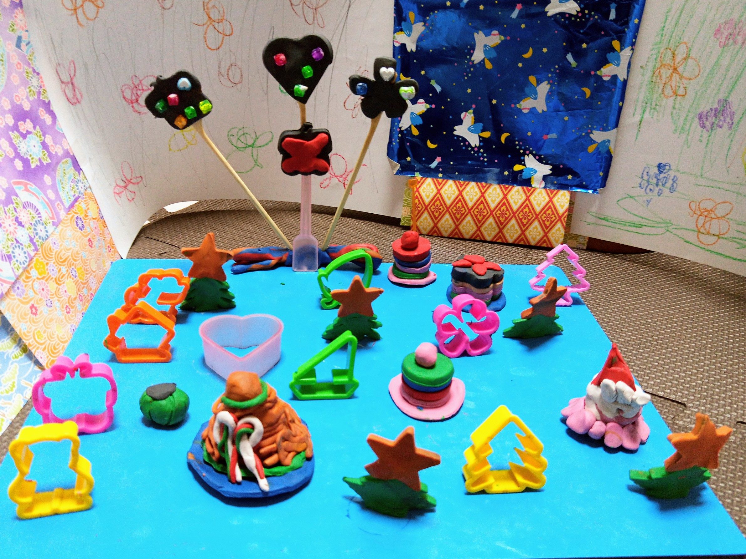 油粘土で色々なケーキを作り、動物の型も置きました。 クリスマスツリーには星をつけて飾りました。 花の絵を描き、千代紙とテープでくっつけて背景にしました♡ 楽しく作りました♪