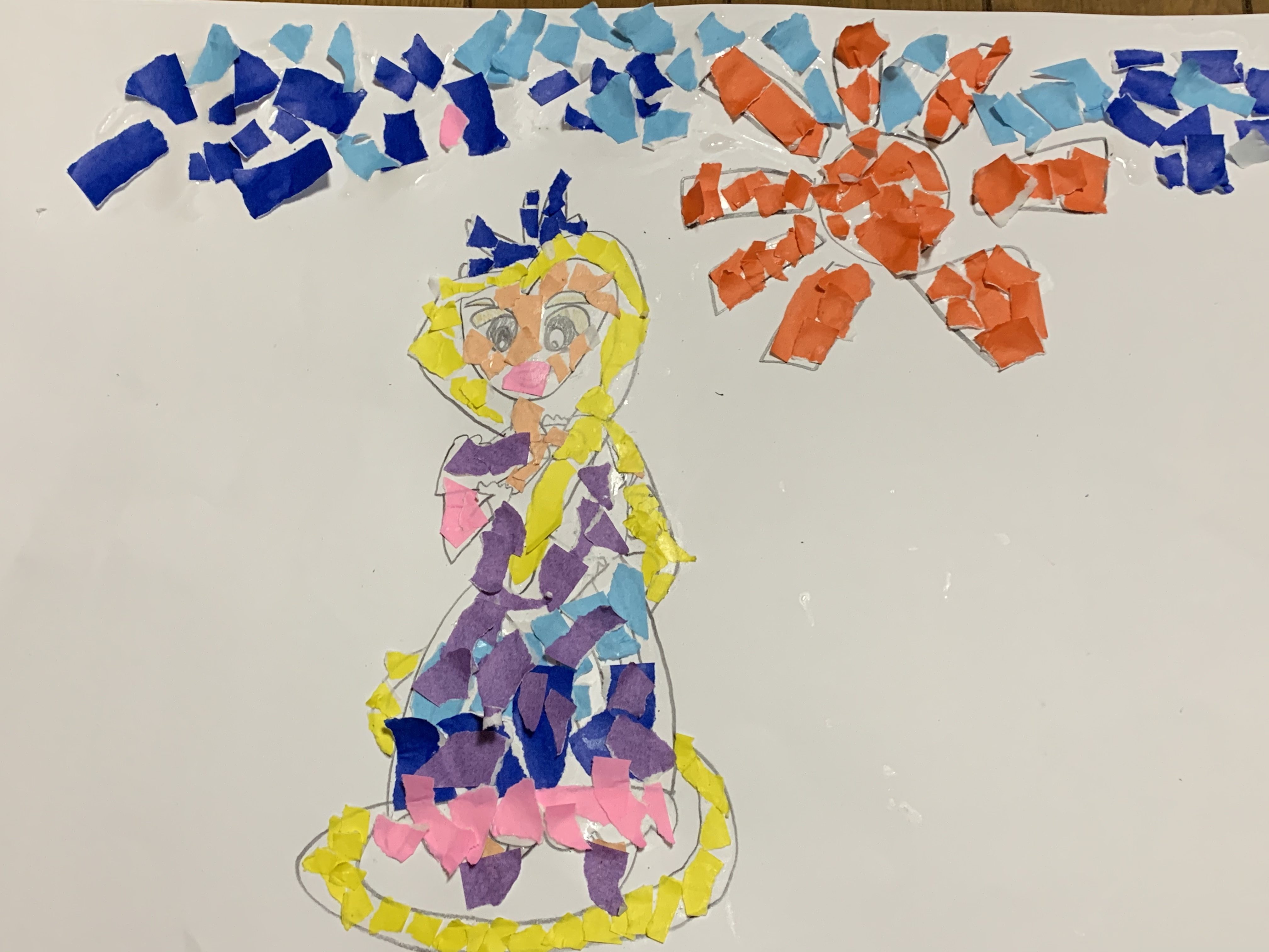 ラプンツェルが塔からそとにでられたところだね! おりがみをこまかくちぎって えにしているんだ! すばらしい! こまかくて 根気のいる作業だろうけど、よくできてるよね!