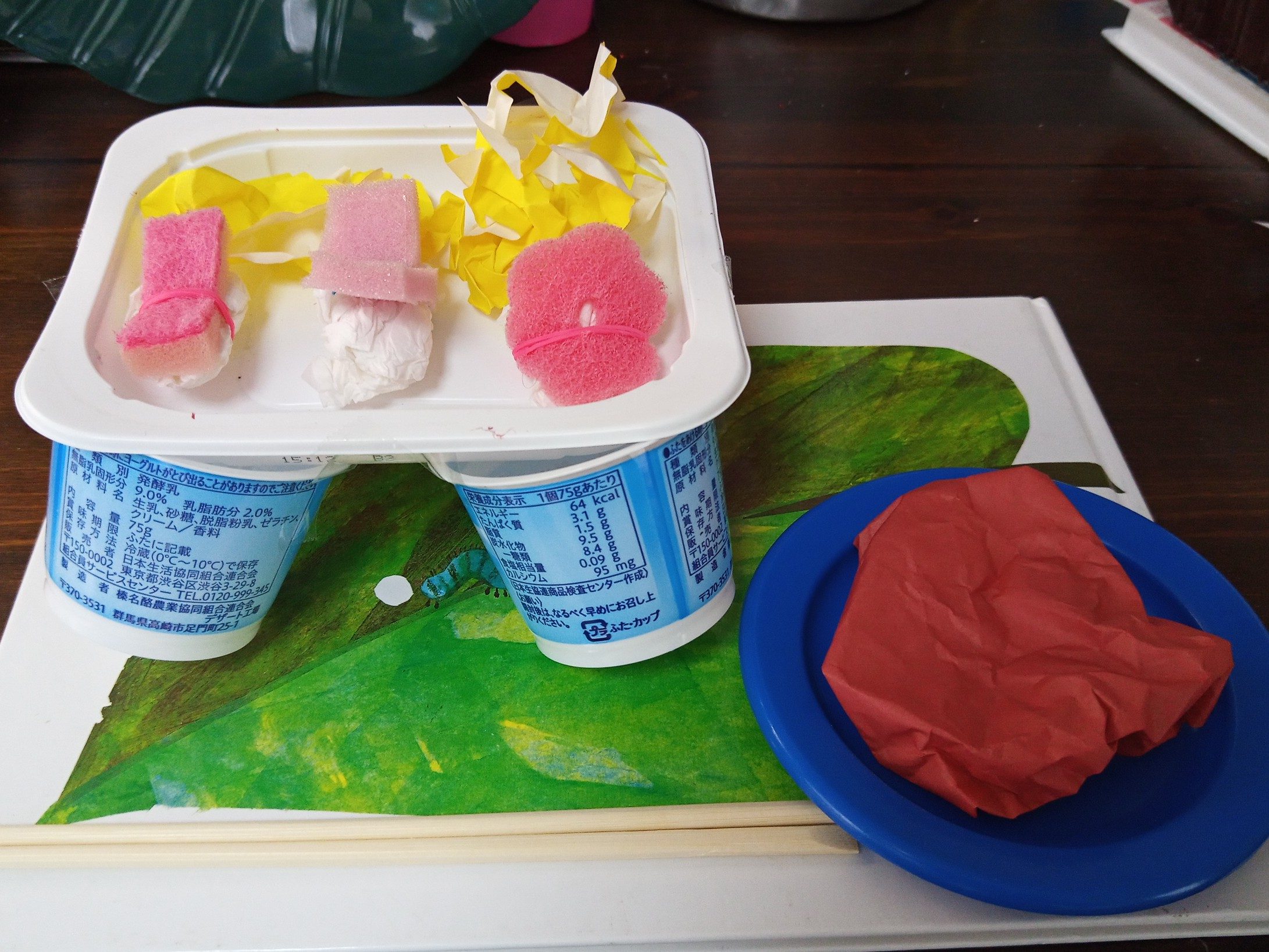 スポンジでマグロを作り、ティッシュのシャリに乗せました。1つはお花型♡