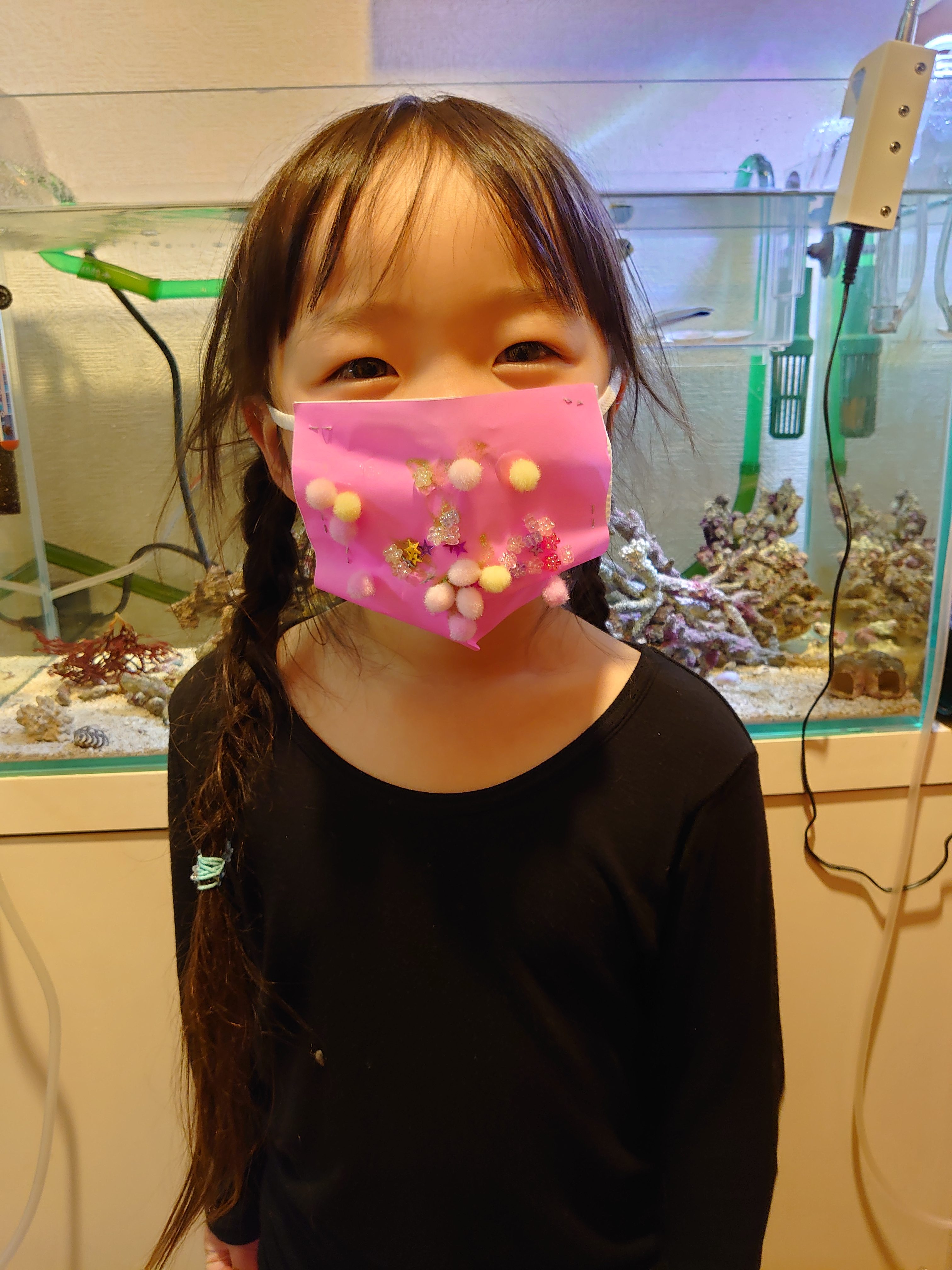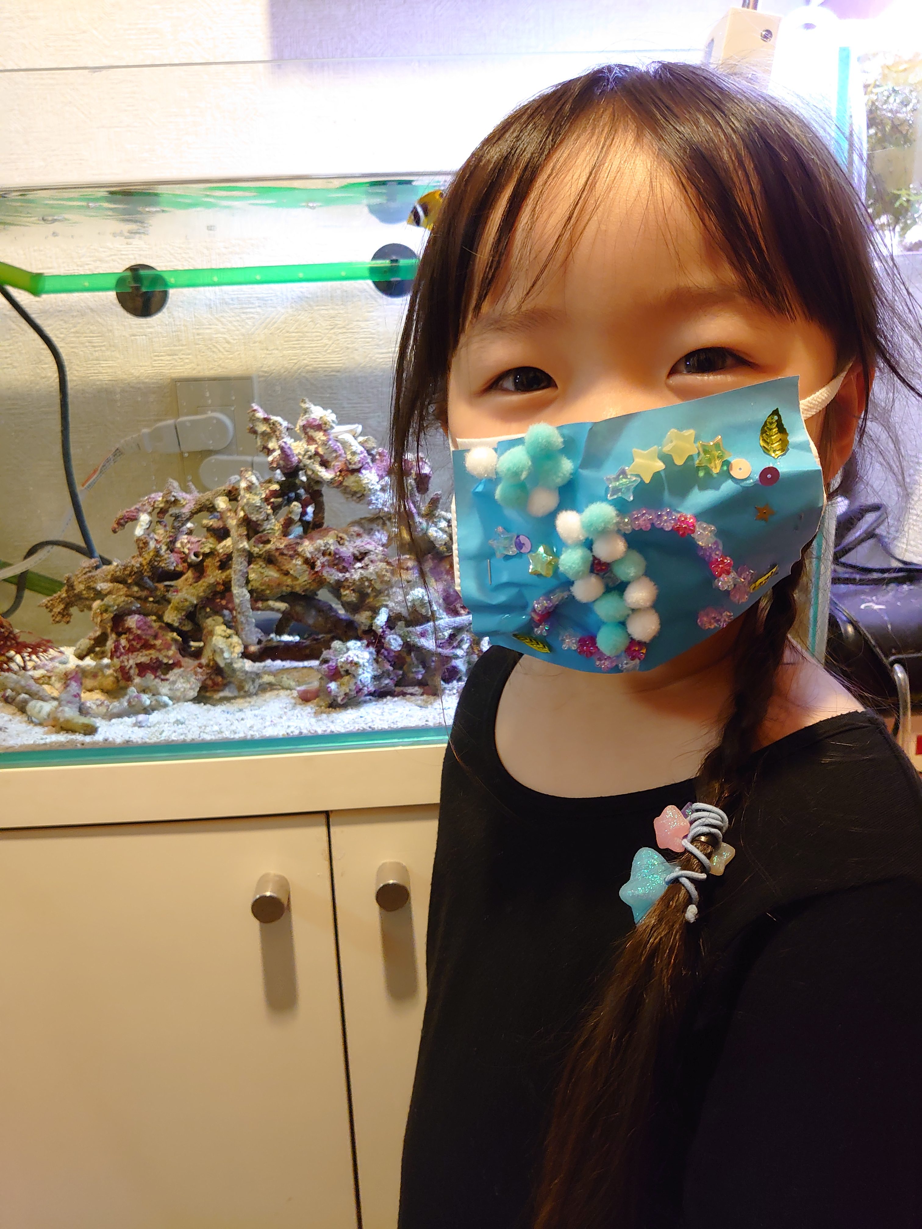 マスクデコアートつくってくれてありがとう!! ぽんぽんやビーズがたくさんついた、キラキラかわいいマスクでばっちり! すいそうのまえでしゃしんをとってもらったのかな? なんだかにんぎょがマスクしてるみたいだね。