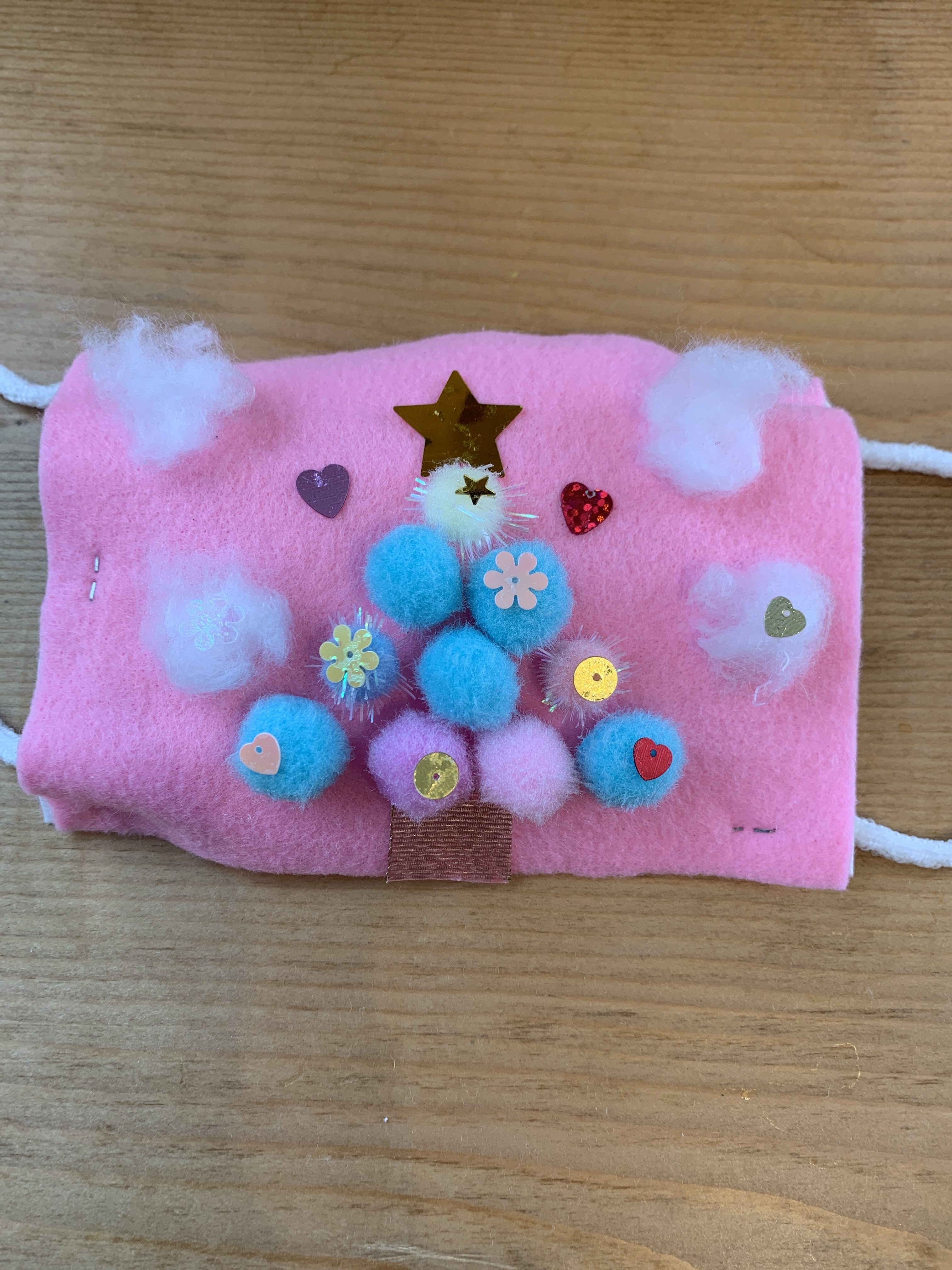 くるみちゃん、ピンクのマスクがかわいいよ! ちっちゃなスパンコールはゆびでつまんでひろうのがむずかしいよね! いちにちまってこのかわいいマスクをつけてるかな? クリスマスのよるにはサンタさんもこのマスクをみるかもね!