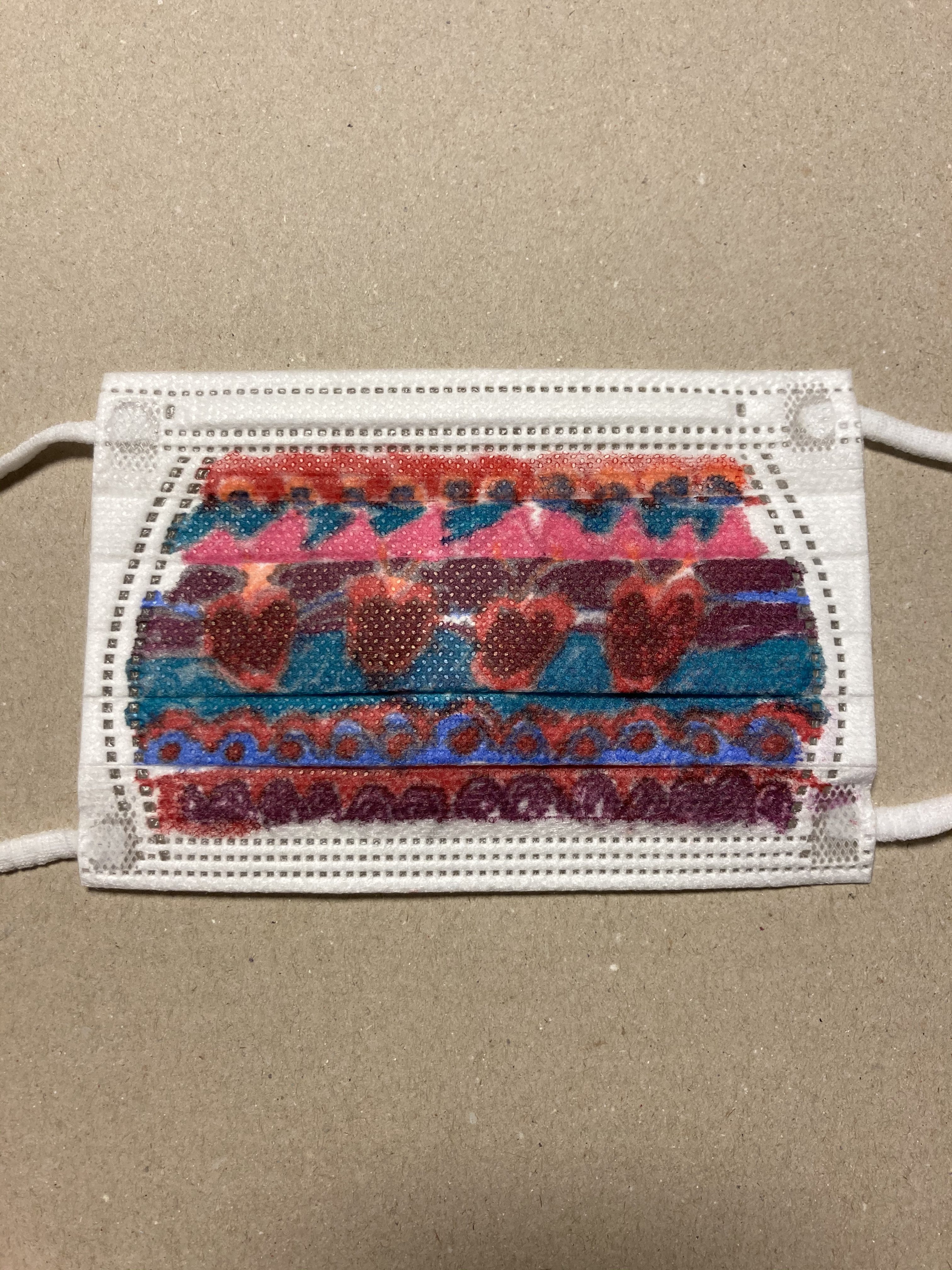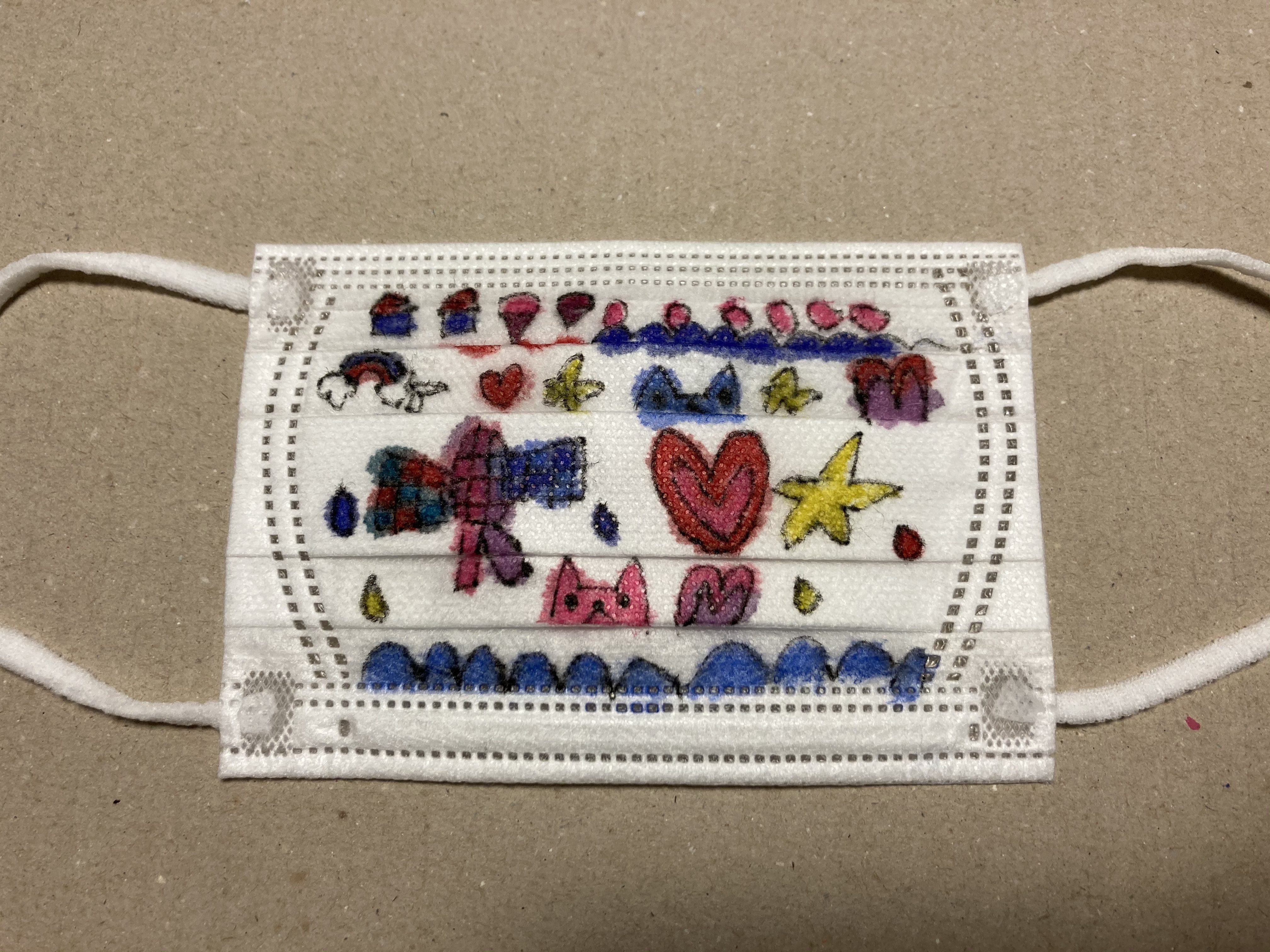 おおおお、すばらしい!! とってもこまかくかきましたね! マジックやカラーペンをつかってかいてくれたのかな! これはおしゃれなマスクです!