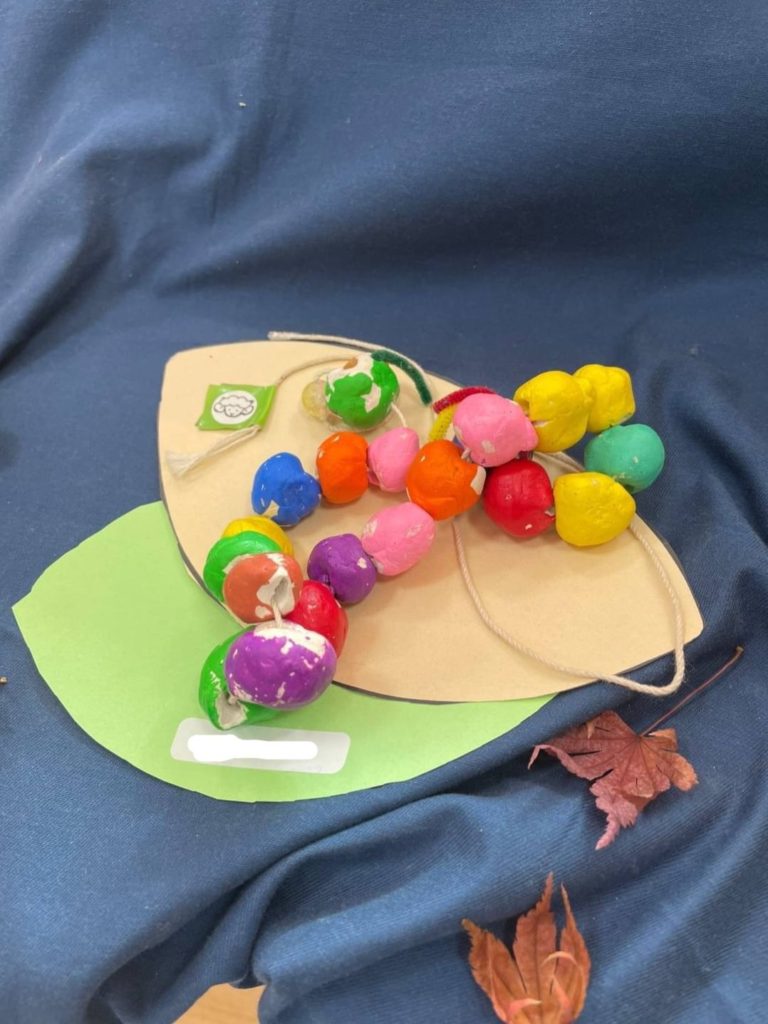 ●3枚目→イモムシさん。たくさん丸めて色を塗って紐を通して、頑張って作ったみたいです。