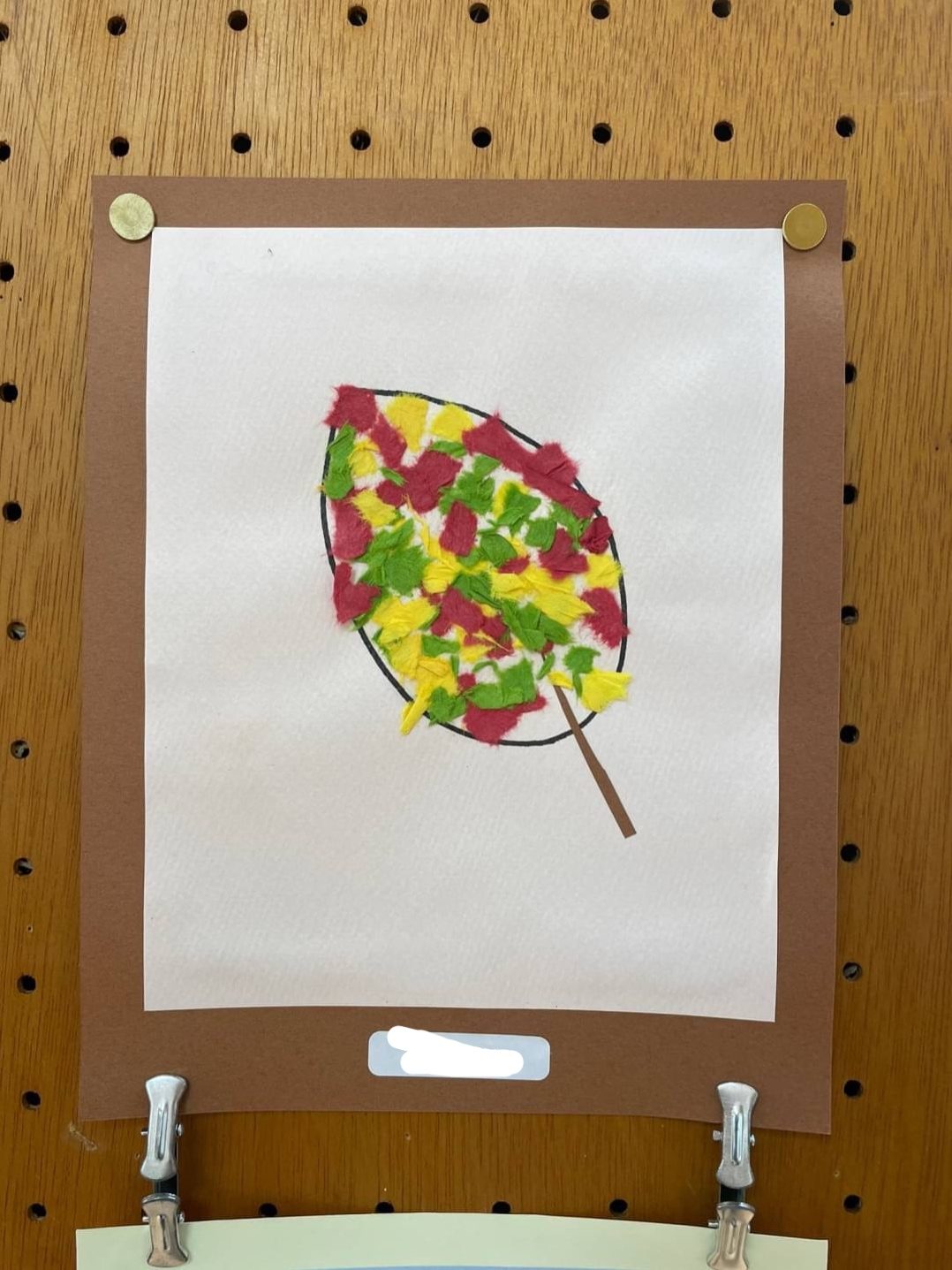 ●1枚目→動物園に行った後に描いたキリンの絵。餌を食べているところを見れて感激したのをお話ししていてくれていました。和紙を貼って模様にしたようです。