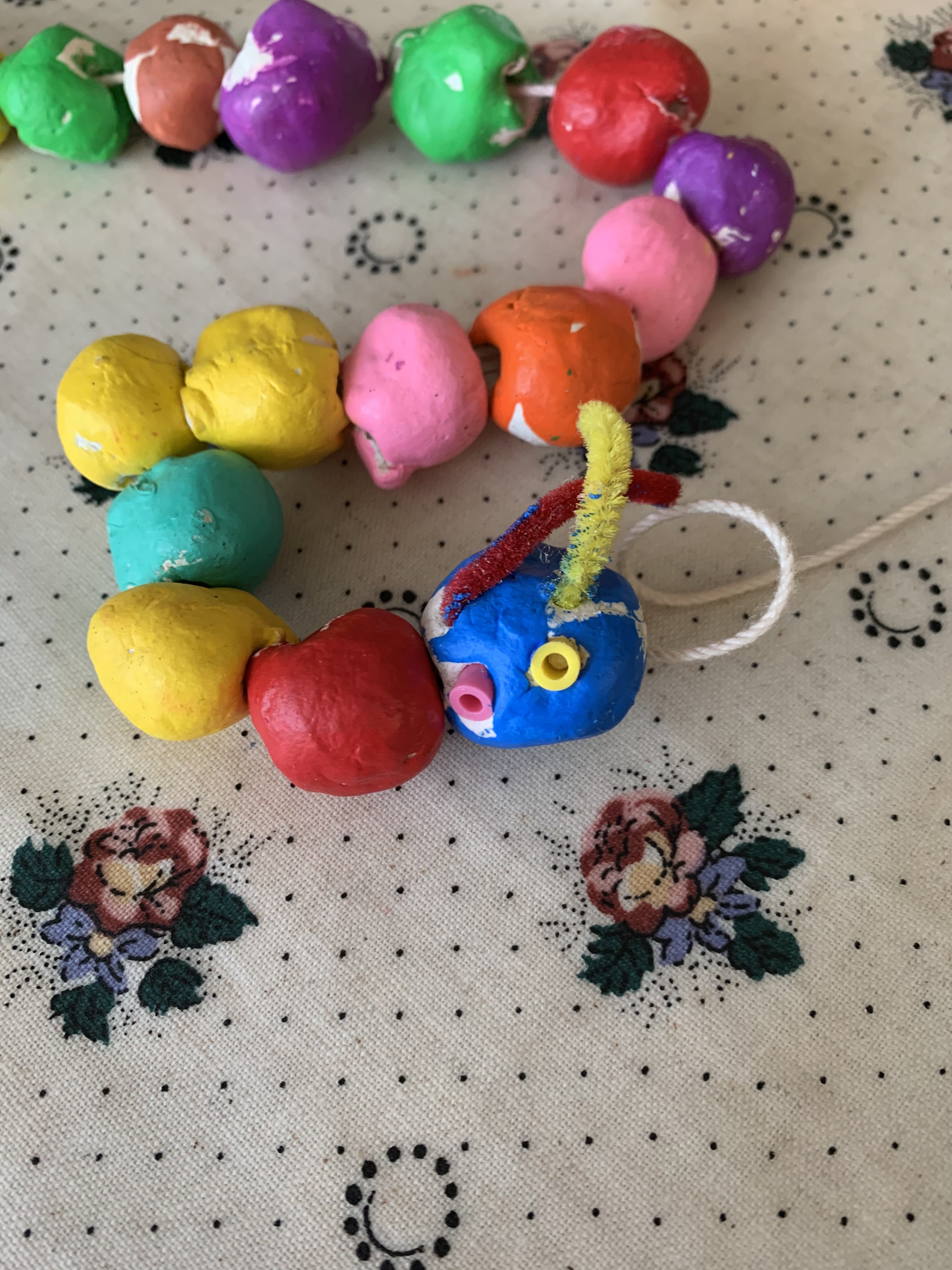 ●3枚目→イモムシさん。たくさん丸めて色を塗って紐を通して、頑張って作ったみたいです。