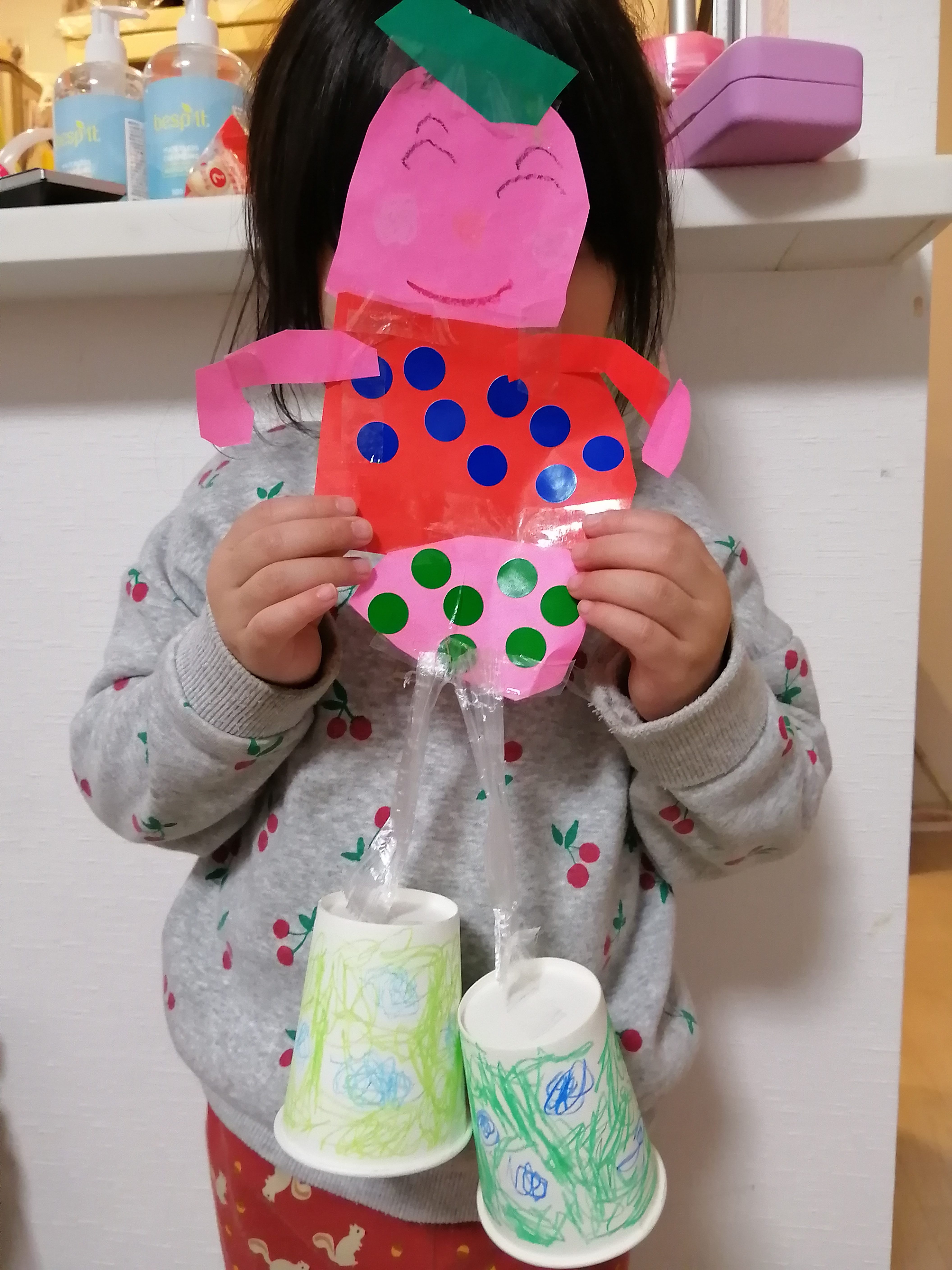 ぴんくのまぁるいのがかおで、おりがみでつくってあります