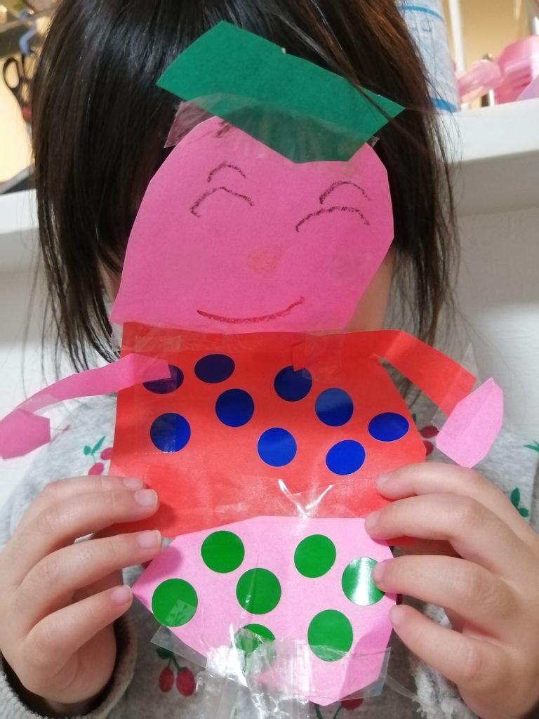 お顔や体、髪の毛や手の折り紙も自分で切って作ったのかな?丁寧に切って細かいとこもテープで貼れていますね!
