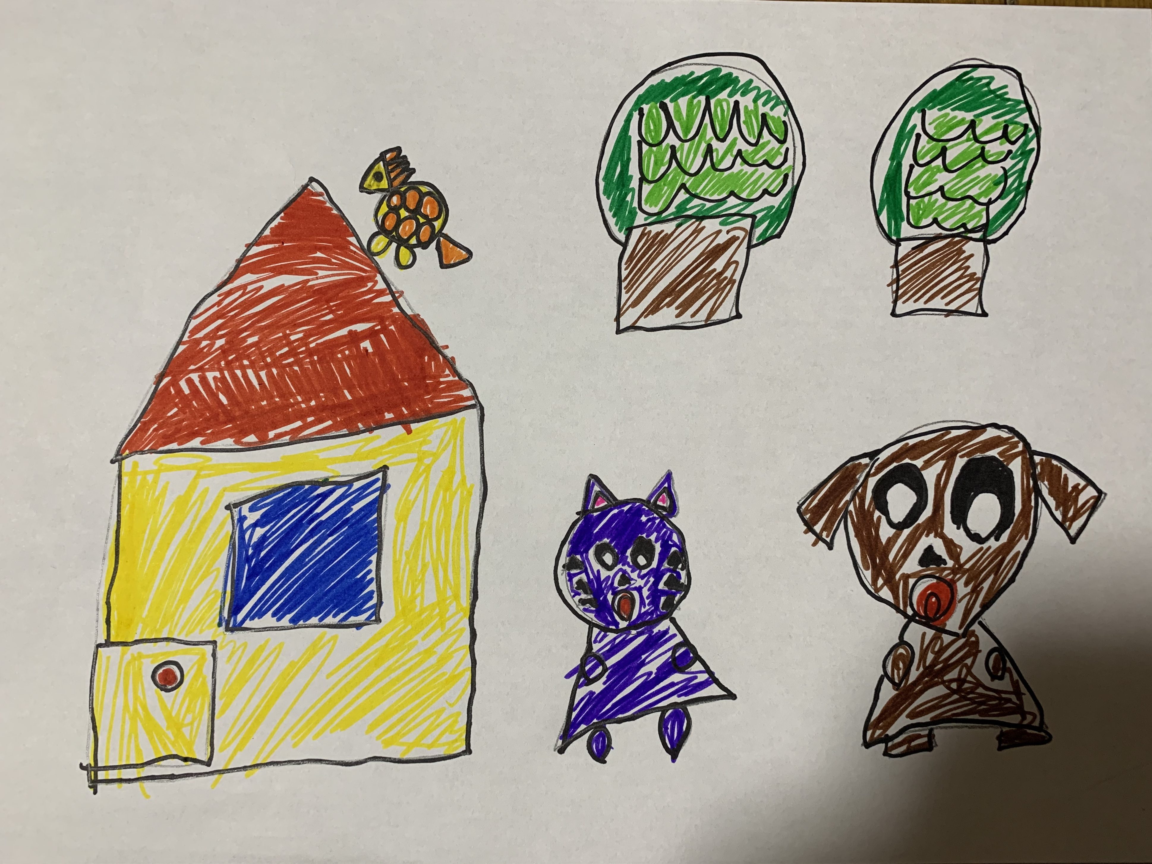 ちゆりちゃん、ありがとう! どうぶつたちは、あさのかいでうたをうたっているのかな? ワンワン、にゃあにゃあ、コケコッコー! えのなかにいろんなまるさんかくしかくがかくれているね!