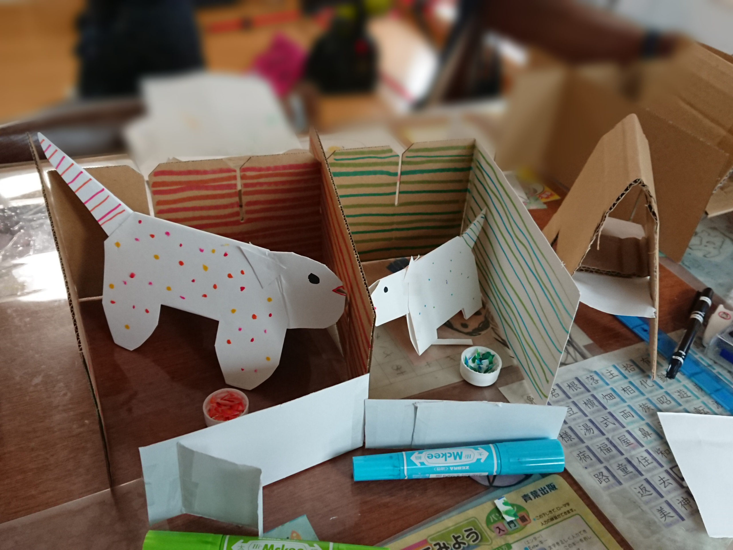 - さきにかんせいのおしゃしんをみてしまったけれど、いろがなくてもとってもステキだね! ダンボールをきったり、はったりするの… >>>