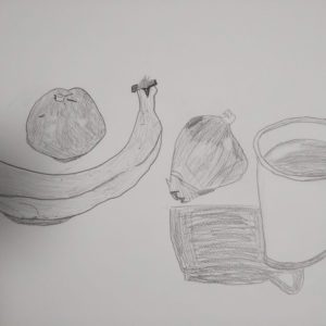 鉛筆の濃淡の描きわけを学びます。 色ごとの陰影に気づき、鉛筆で表現します。 最後にデッサンとして形を描き、陰影をつけて描きます。