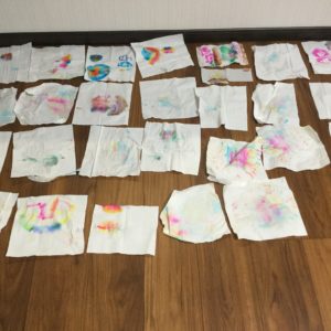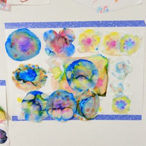 カラーペンを水でにじませてきれいな紙を作る遊びです。作った紙で構成遊びにつなげるのもOK