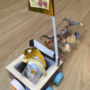 1年間の積み重ねの廃材工作 ・身近にある廃材を作品に変身させる価値の変換 ・仕組み、仕掛け興味を持って工作する ・セロテープやハサミなど素材によって道具を使いこなす ・作ったもののデザインや装飾にこだわってオリジナルの作品にする