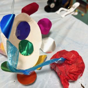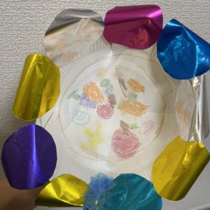 プラコップと紙ざら、お花紙でできる。かわいいけんだま!身近なものでこんなかわいいものができるなんて!嬉しいね。作って遊べる工作です。