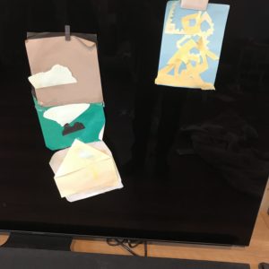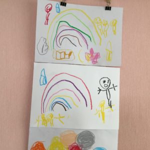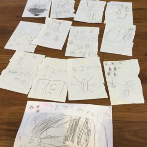 - いつもありがとうございます。 左下は、、台風。 イカの上は、ホタテだそうです。 何を描いたか覚えていないものもあるようで… >>>