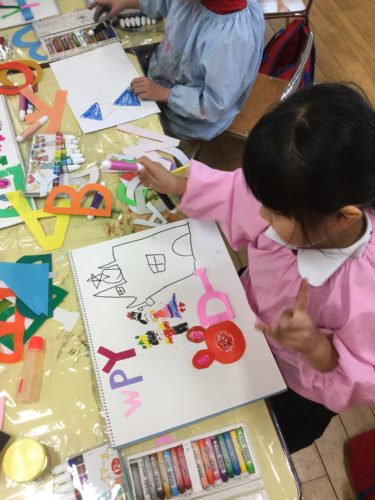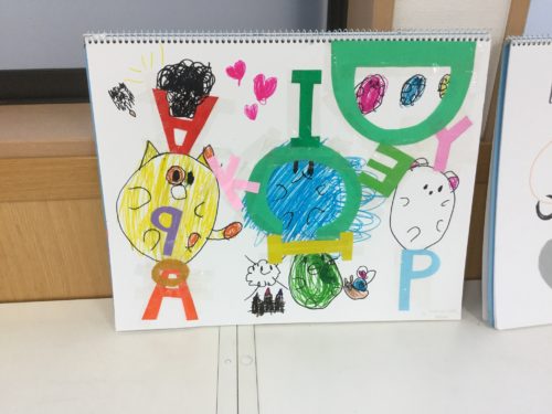 幼児さんは「アルファベットからの発想画」の制作をしました。アルファベットからこんな面白くて素敵な作品が出来上がってしまう久米川美術教室の子たちは天才ですね!