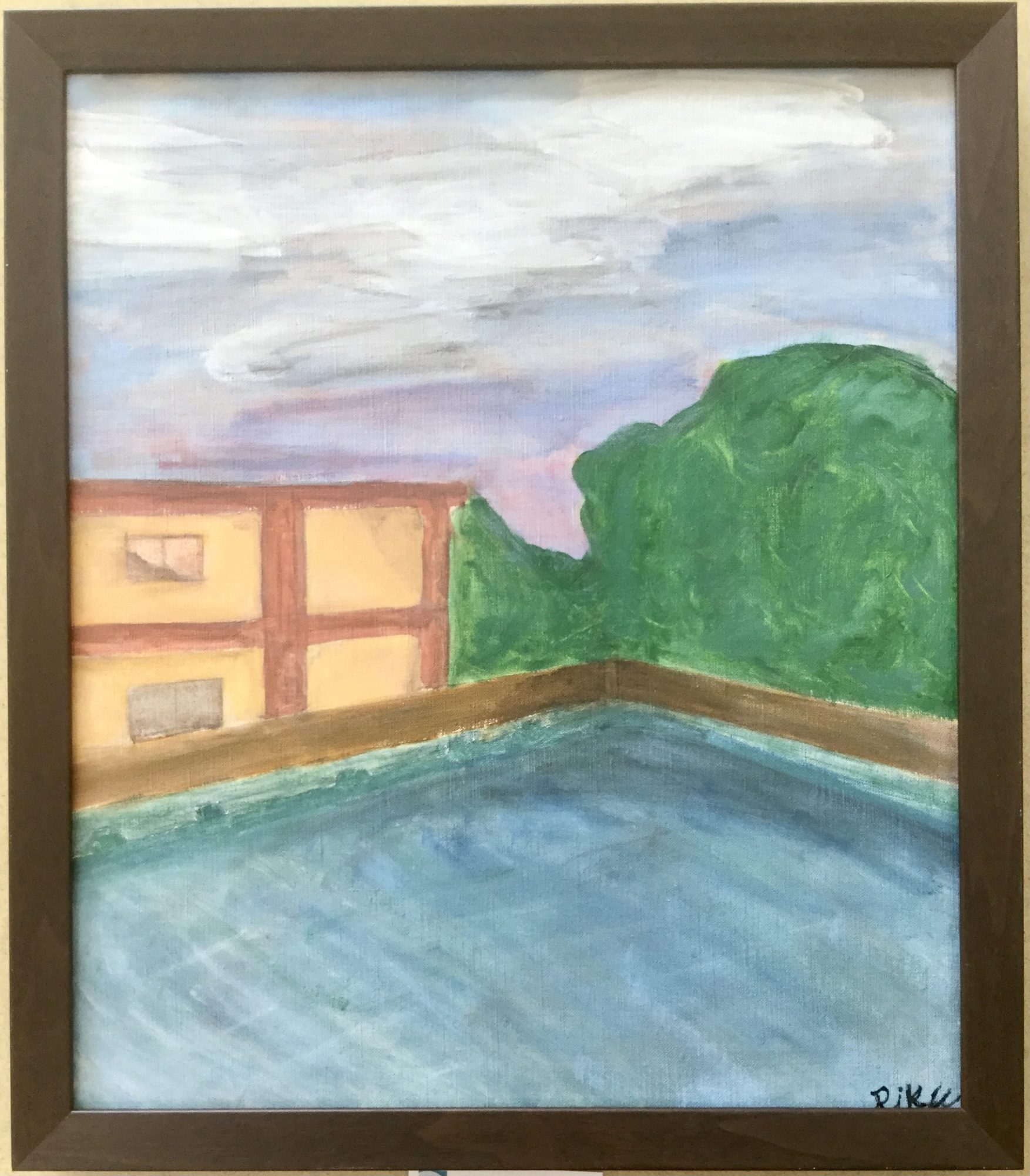 彼は水泳部に所属していました。夕暮れのプールサイドの絵でしょうか。水面を見つめる作者の穏やかな心情が伝わってくる素敵な作品です。