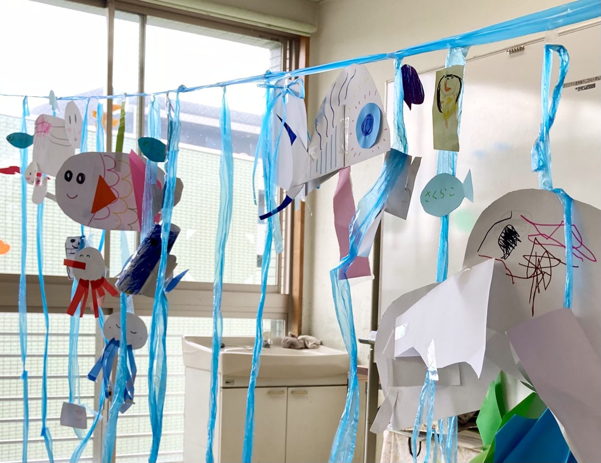 初めは机の上で海の生き物をイメージしながら作っていた子ども達も、最後の方は動きながら、作っては飾る→また作る→飾るといった行為をぐるぐると行なっていきます。