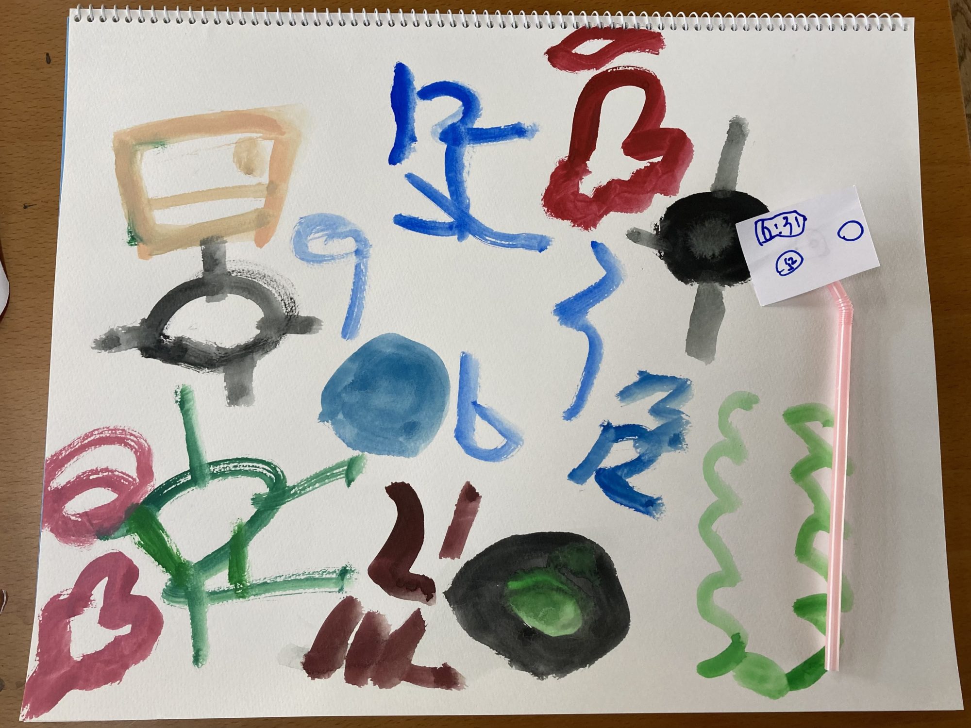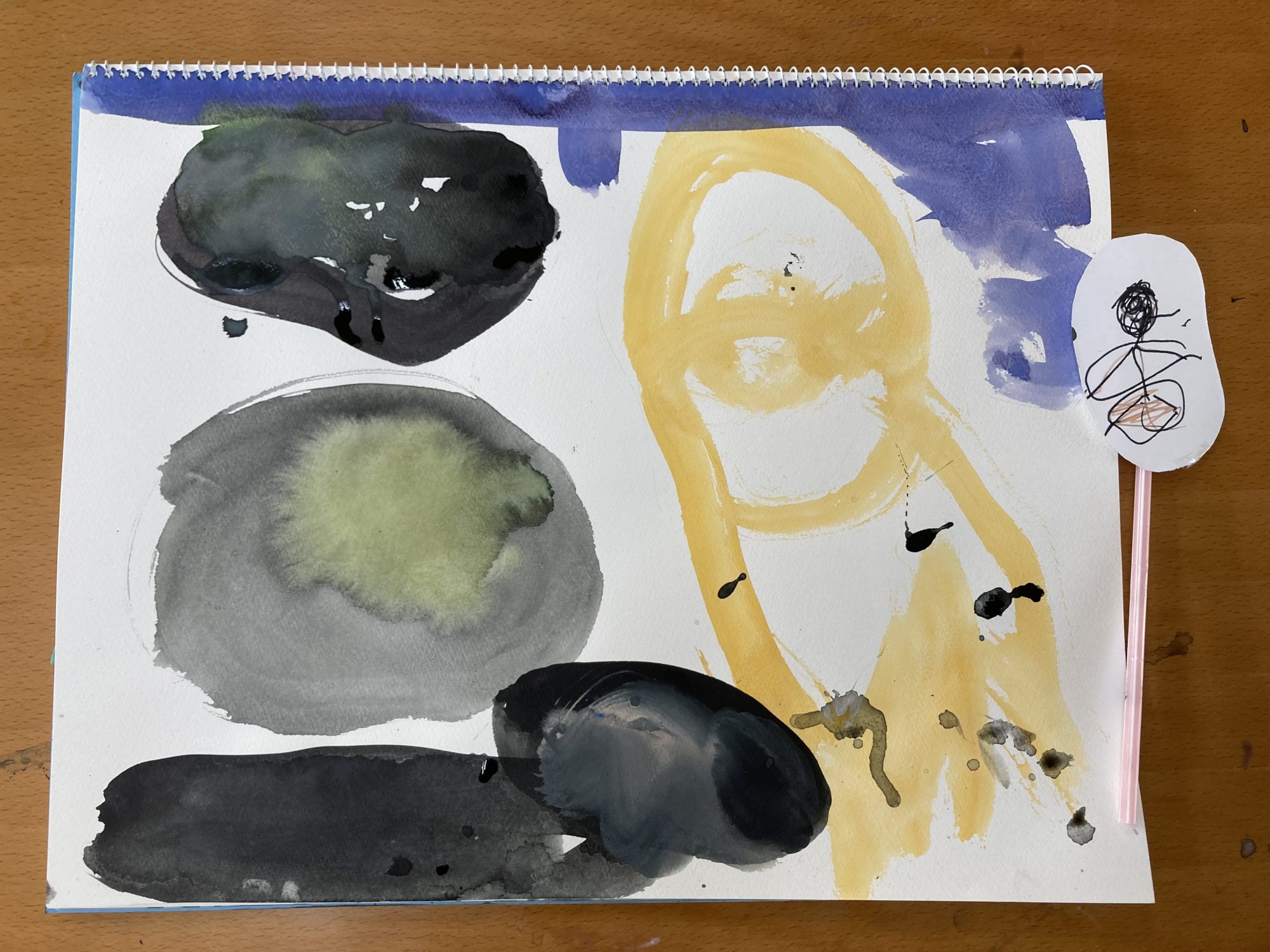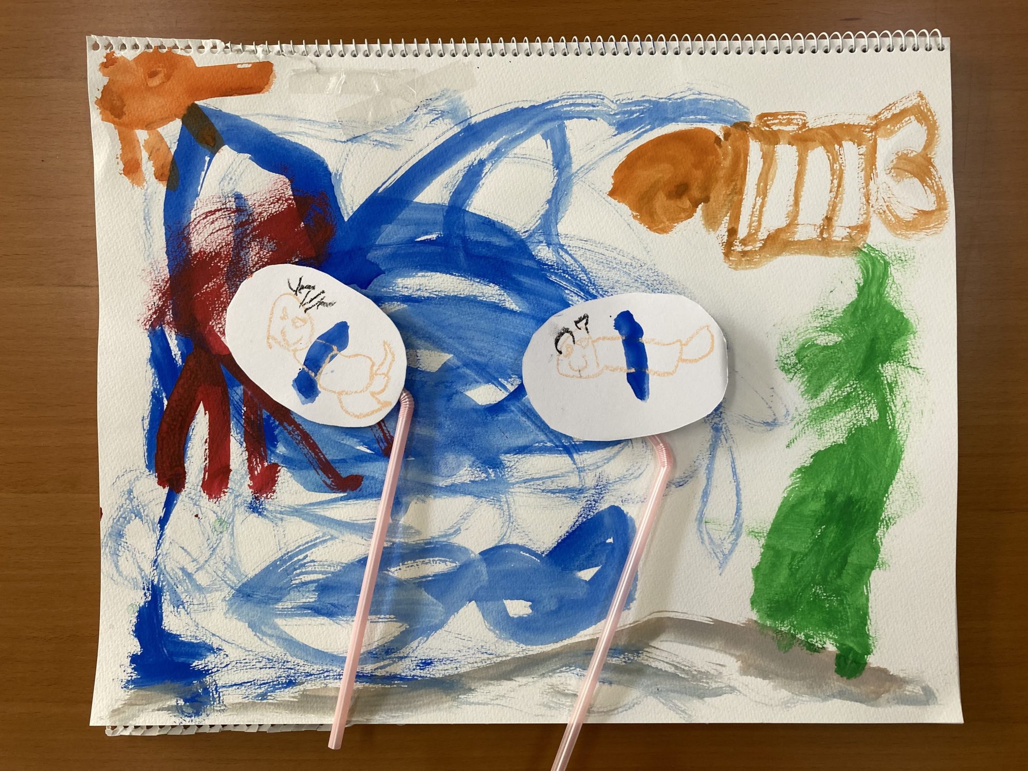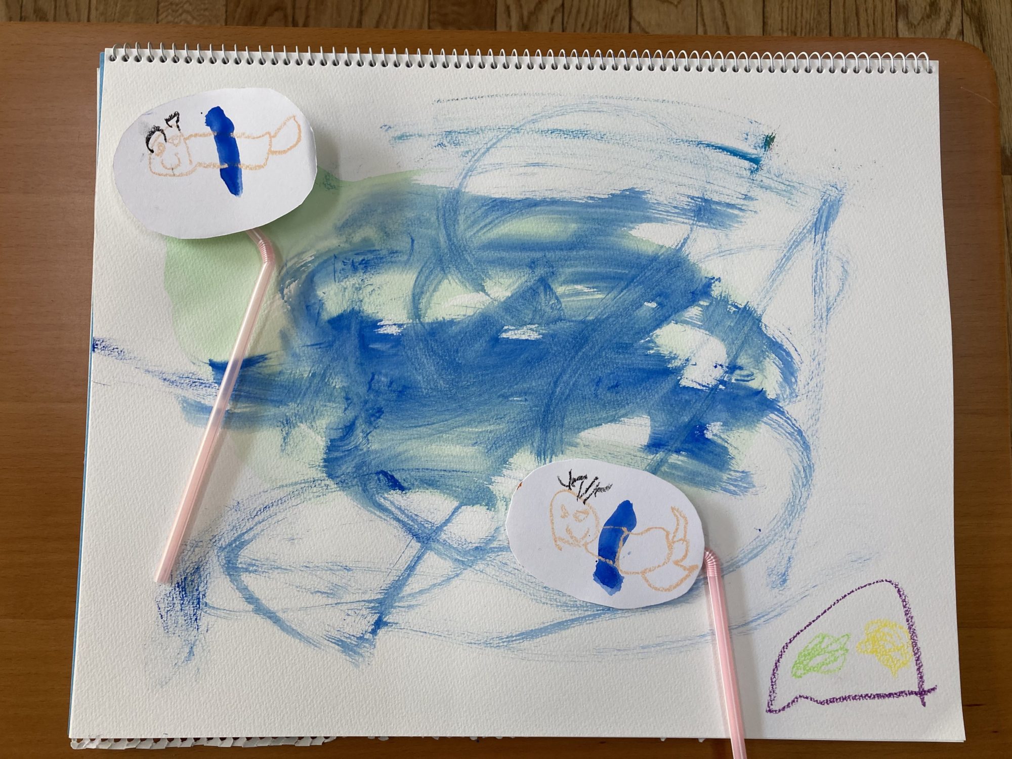 まず最初に海の世界に冒険に行きたいお友達を作りました。丸く切った画用紙に好きなお友達を描いて、ストローをつけています。この子はぼくわたしの代わりになって、イメージの世界に潜り込んでくれます。