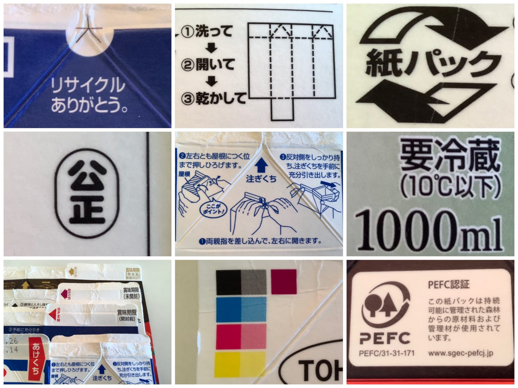 そして、いろいろなメーカーの牛乳パックを見比べて見ると、少しずつデザインが異なっていても、ほぼ同じところに決まったマークがついているなあと気づきました。