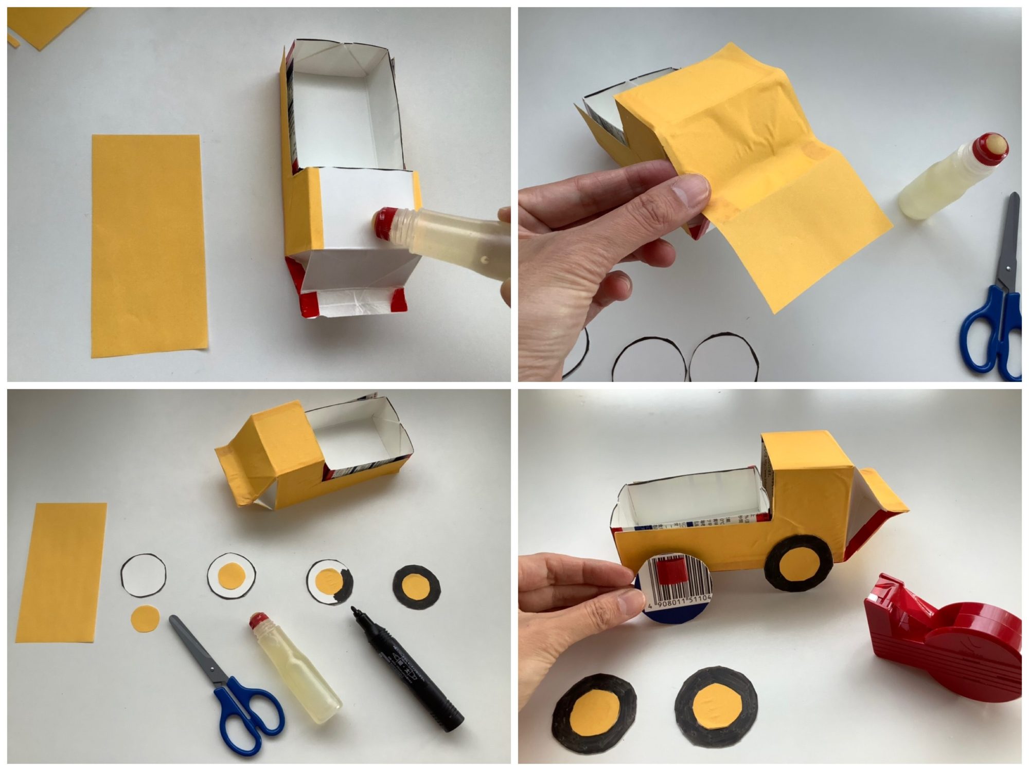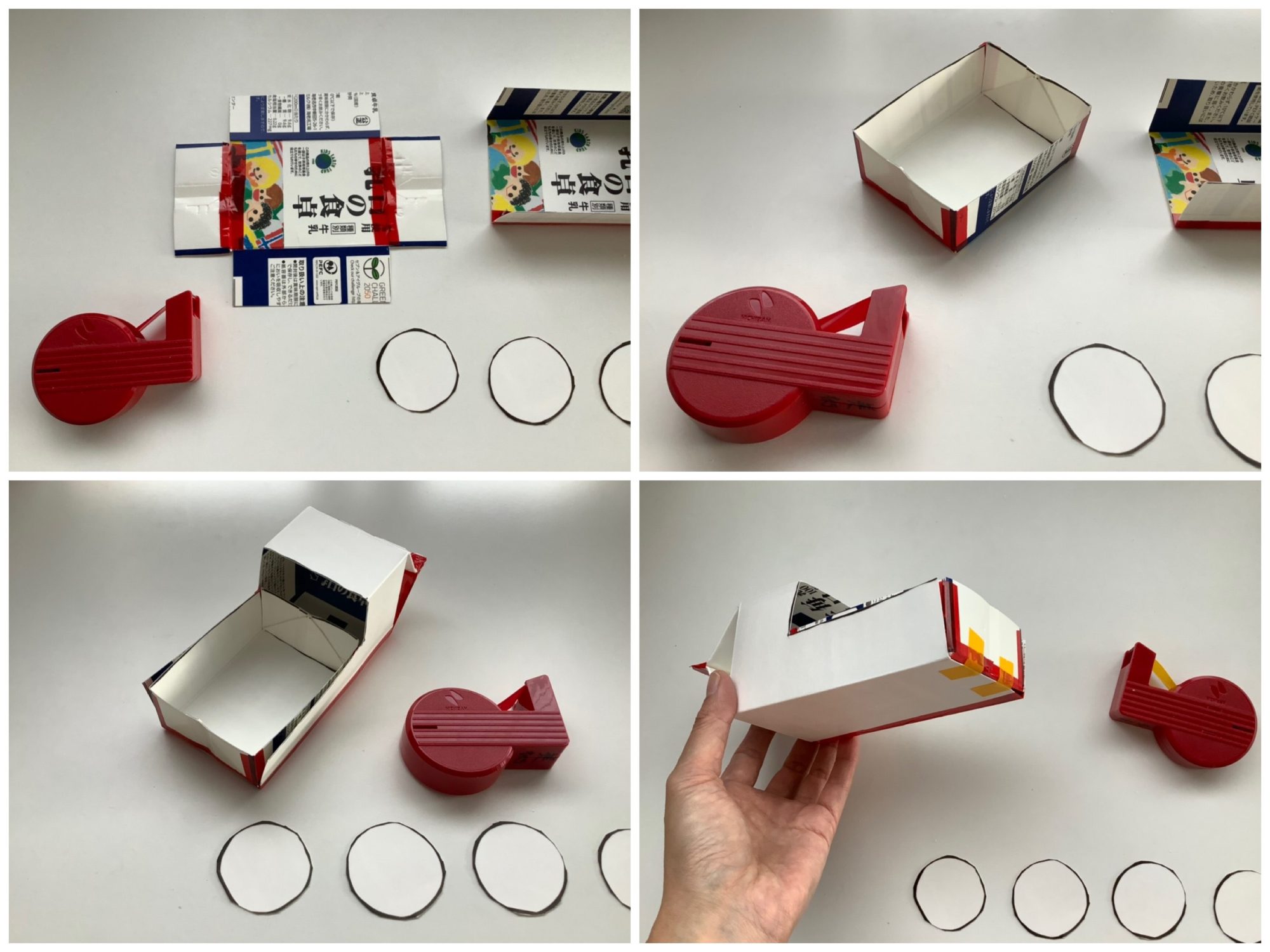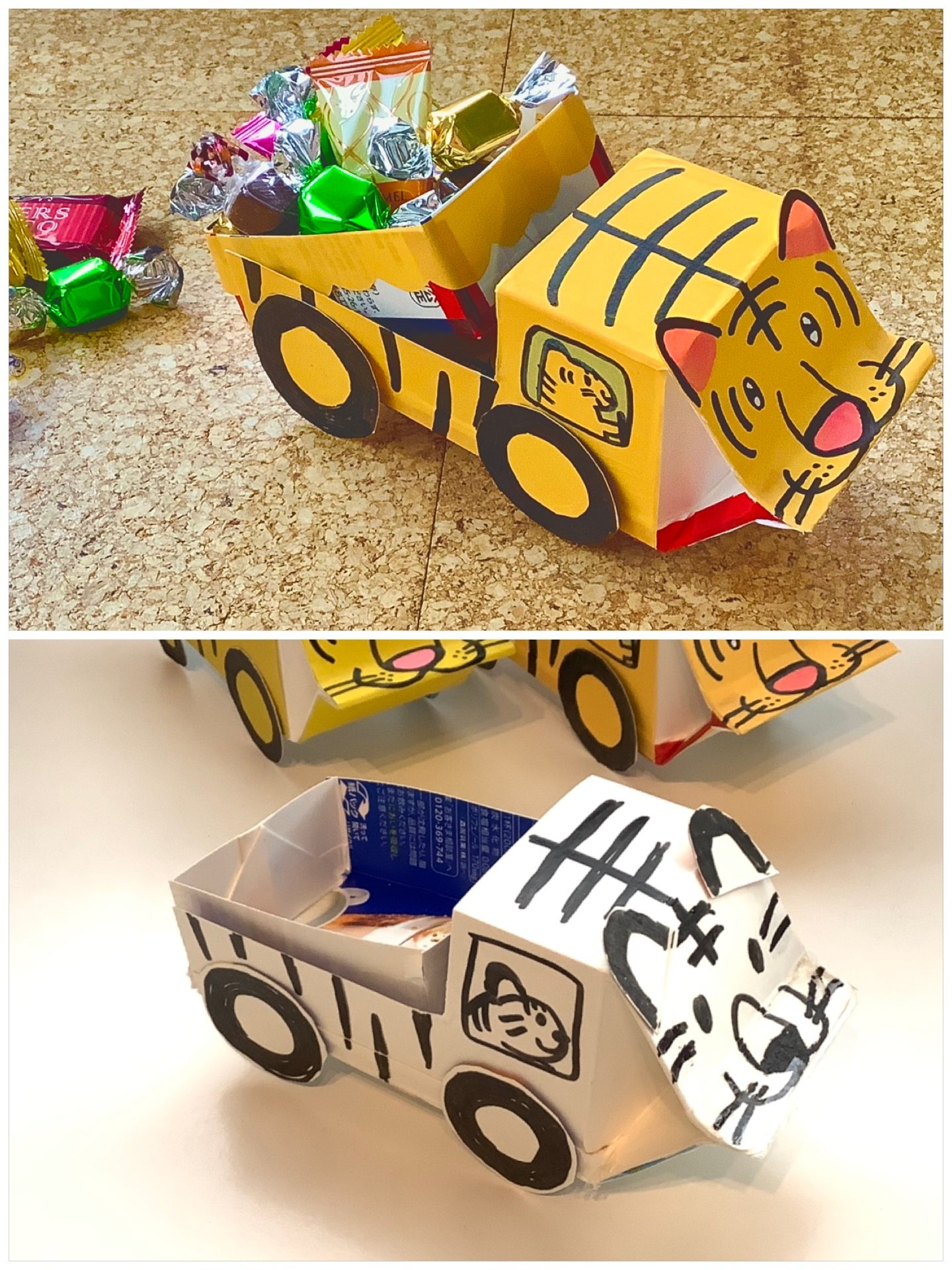 「牛乳パック」で作る「幸せ運ぶトラトラック」です。