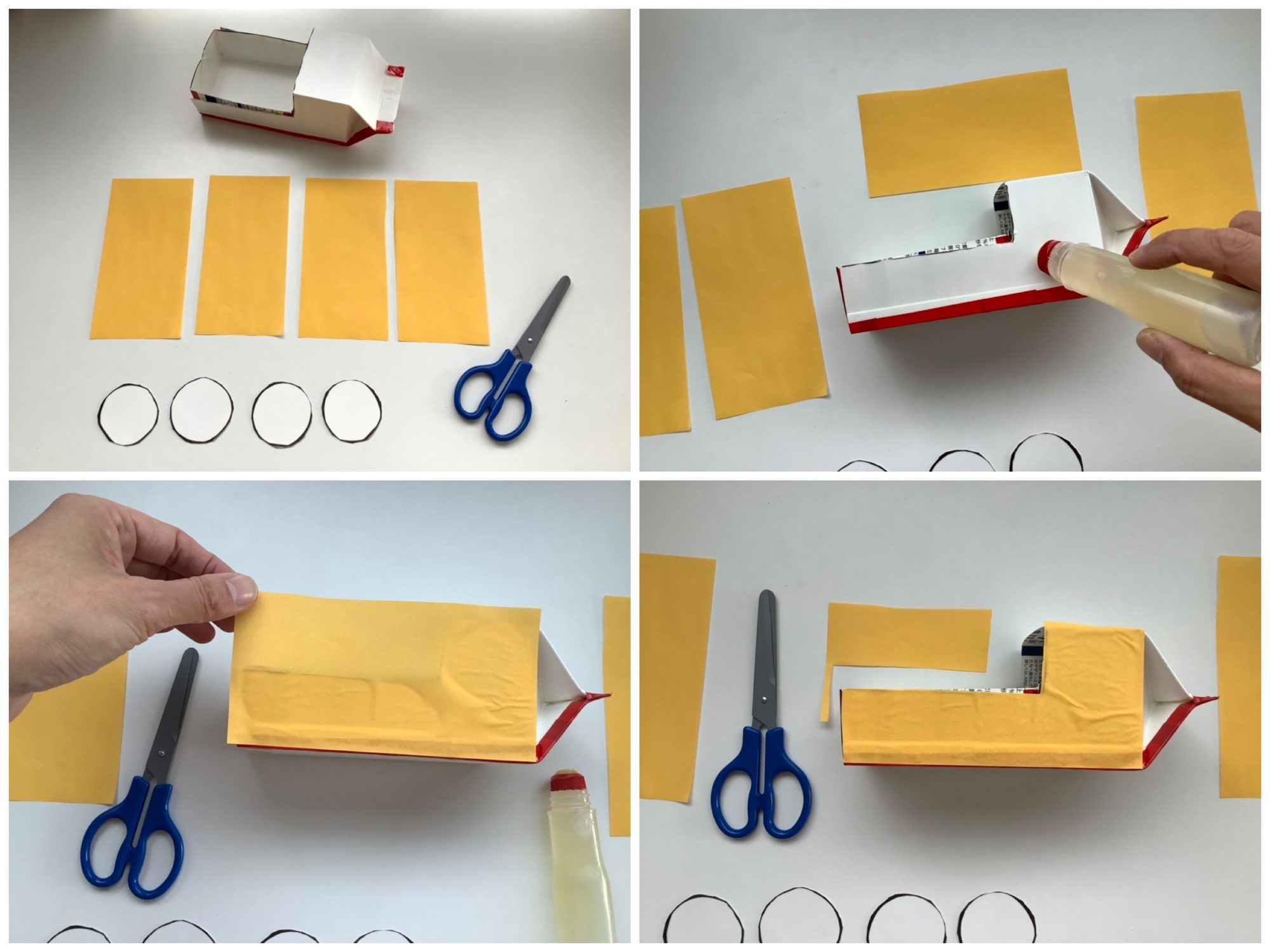 車体の前の部分にも折り紙をのりで貼りつけます。余った部分もくるりと折り込んで貼ってしまいましょう。
