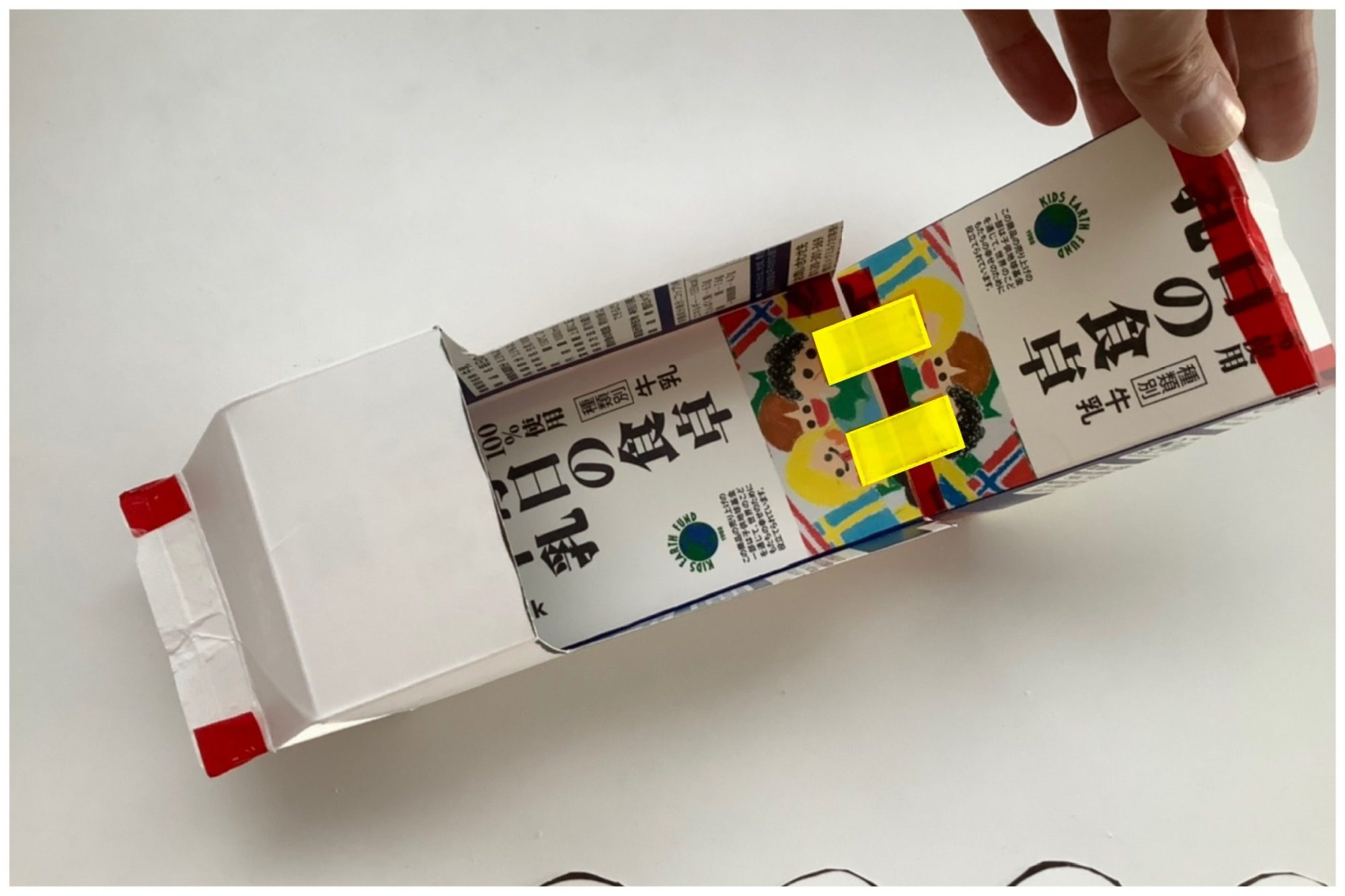 パックの上の部分を、白い方を表にし、切り開いた部分をセロハンテープでつなぎなおします。