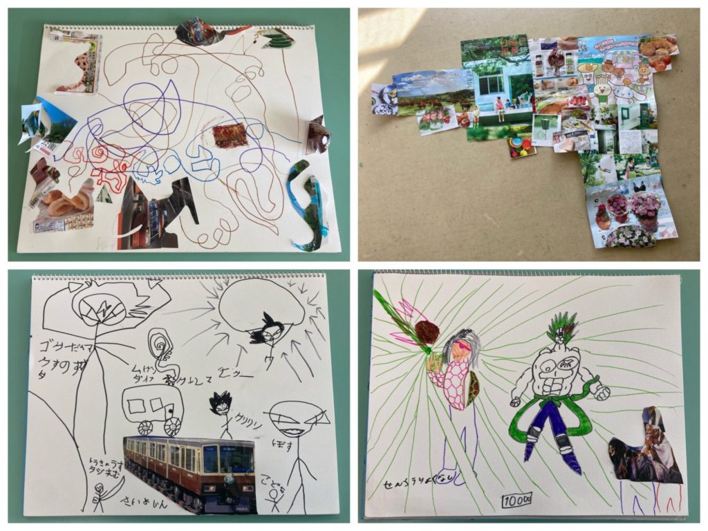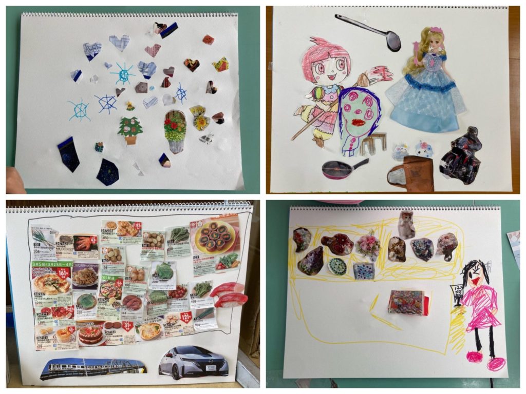 右下の子はとにかく貼った後、最後にお店やさんを思いついて店内になっていました。まずは手を動かすことでやりながらその後の展開を思いつく子もいます。