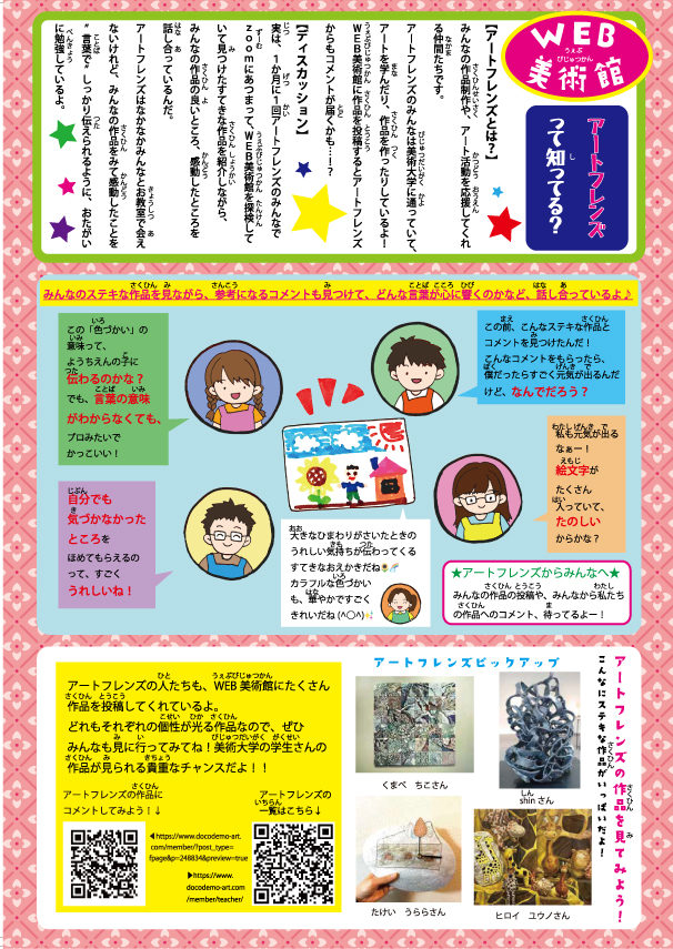 ピカソくん『2022夏』 投稿日 : 2022年8月29日 ピカソくんから大大大発表!!! イベントのアーカイブ動画とレポートが上がってるよアイコンをクリックして見に行ってみよう↓↓ そしてweb美術館からはアートフレンズのお知らせだよ 今回のアーティストはみんなも知ってるかな…? 今回間違い探しを描いてくれたのは 福本雪乃先生でした♪ 次回のピカソくんもお楽しみに~ 全体ブログ アートクラス ブログ ピカソくん『2022夏』 作者: どこでもアート先生 先生 どこでもアート先生の他の作品・紹介を見る ≫ どこでもアート先生のブログ投稿 2021/8/18 ピカソくん【2021年夏号】ピカソくん 2022/1/29 ピカソくん【2021年冬号】ピカソくん 2022/7/15 保護中: 夏の特別講座 ZoomURLや材料など 2023/3/29 ピカソくん『2022冬』ピカソくん 2022/11/29 ピカソくん『2022秋』ピカソくん