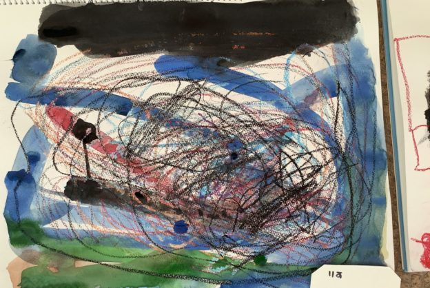 だんだん描いているうちに、クレヨンや絵の具での色混ぜの体感とおしゃべりを伴いながら、太陽や光、お話、レーザービームなど、それぞれ描きたいものやイメージをお絵描きし、春や初夏のイメージをのせていきました。