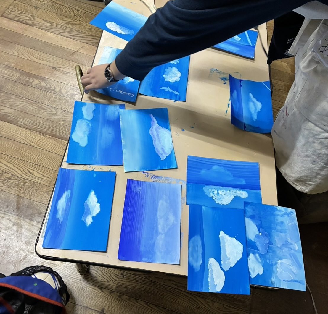 みんなの筆の動きがどこかアニメーターのようで、教室には素敵な空がたくさん広がりました。