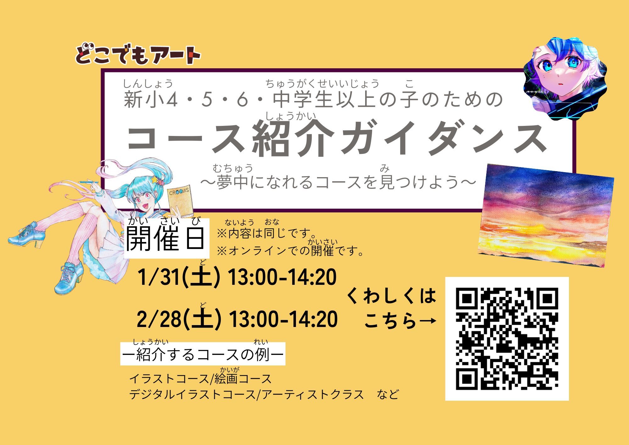 小学4年生以上のお子様必見!イラストや絵画、専門的なコースで、「好き」をのばしましょう!