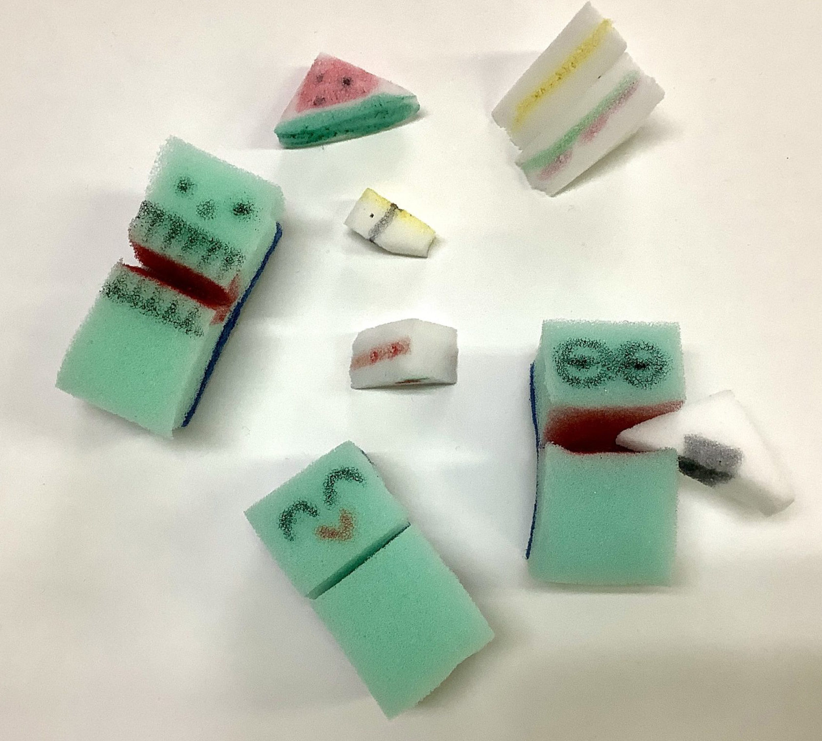 材料は、台所でおなじみのあのスポンジです。切り込みを入れて「口」を作り、油性ペンで顔を描いたら、もうそれだけで立派な「スポンジちゃん」のできあがり。折り紙でお洋服を作ってあげたり、食べ物を作って口に挟ませてあげたり、お家や乗り物を作ってあげたり…。子どもたちは思い思いに、自分だけの小さな友達の世界を広げていきます。