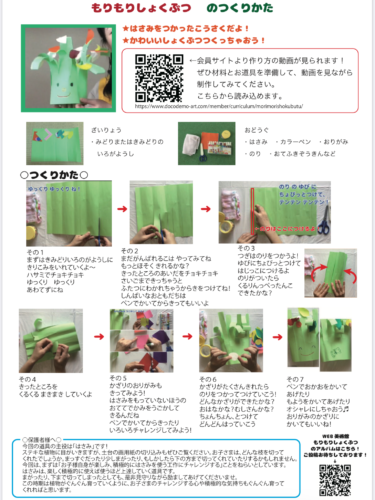 今回の道具の主役は「はさみ」です! ステキな植物に目がいきますが、土台の画用紙の切り込みもぜひご覧ください。お子さまは、どんな枝を切って くれたでしょうか。まっすぐだったり少しまがったり、もしかしたら下の方まで切ってくれていたりするかもしれません。 今回は、まずは「お子様自身が楽しみ、積極的にはさみを使う工作にチャレンジする」ことをねらいとしています。 はさみは、楽しく積極的に使えば使うほど上達していく道具です。 まがったり、下まで切ってしまったとしても、是非見守りながら励ましてあげてくださいませ。 この時期は植物がぐんぐん育っていくように、お子さまのチャレンジする心や積極的な気持ちもぐんぐん育って くれればと思います。