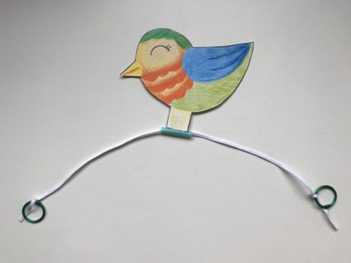 結んだカードリングを持って、たてにひっぱると、とりさんがトントントンと揺れながらおりていきます。